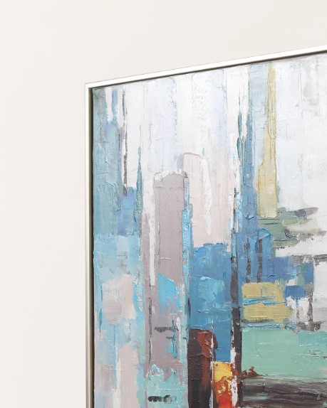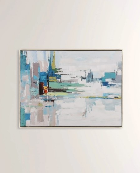 Картина сочетает в себе современные угловатые элементы с прохладной приглушенной цветовой палитрой. Мягкий лазурный, синий и нейтральные серые цвета на холсте подчеркивают его текстуру, картина обрамлена серебряной рамой. Можно разместить горизонтально или вертикально.