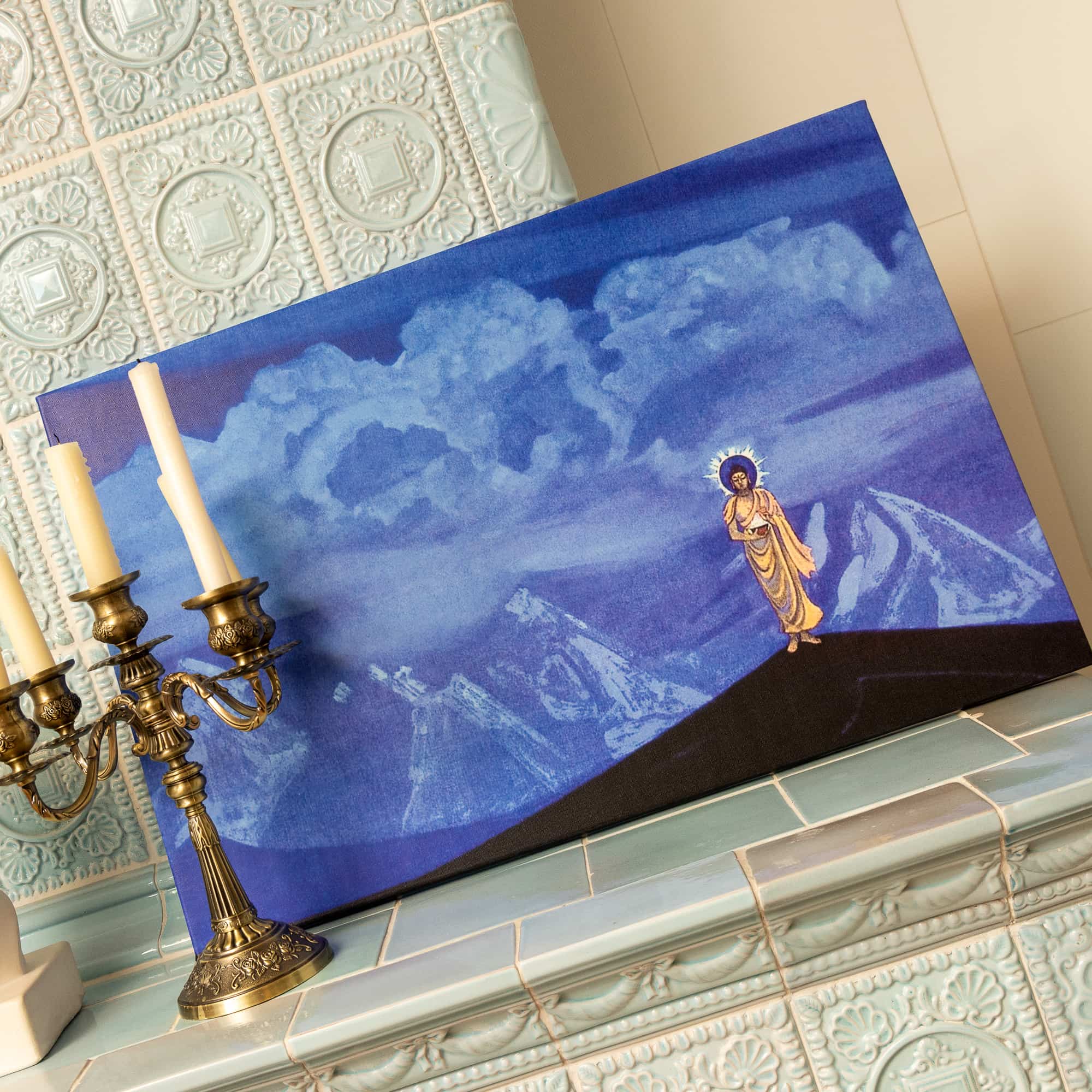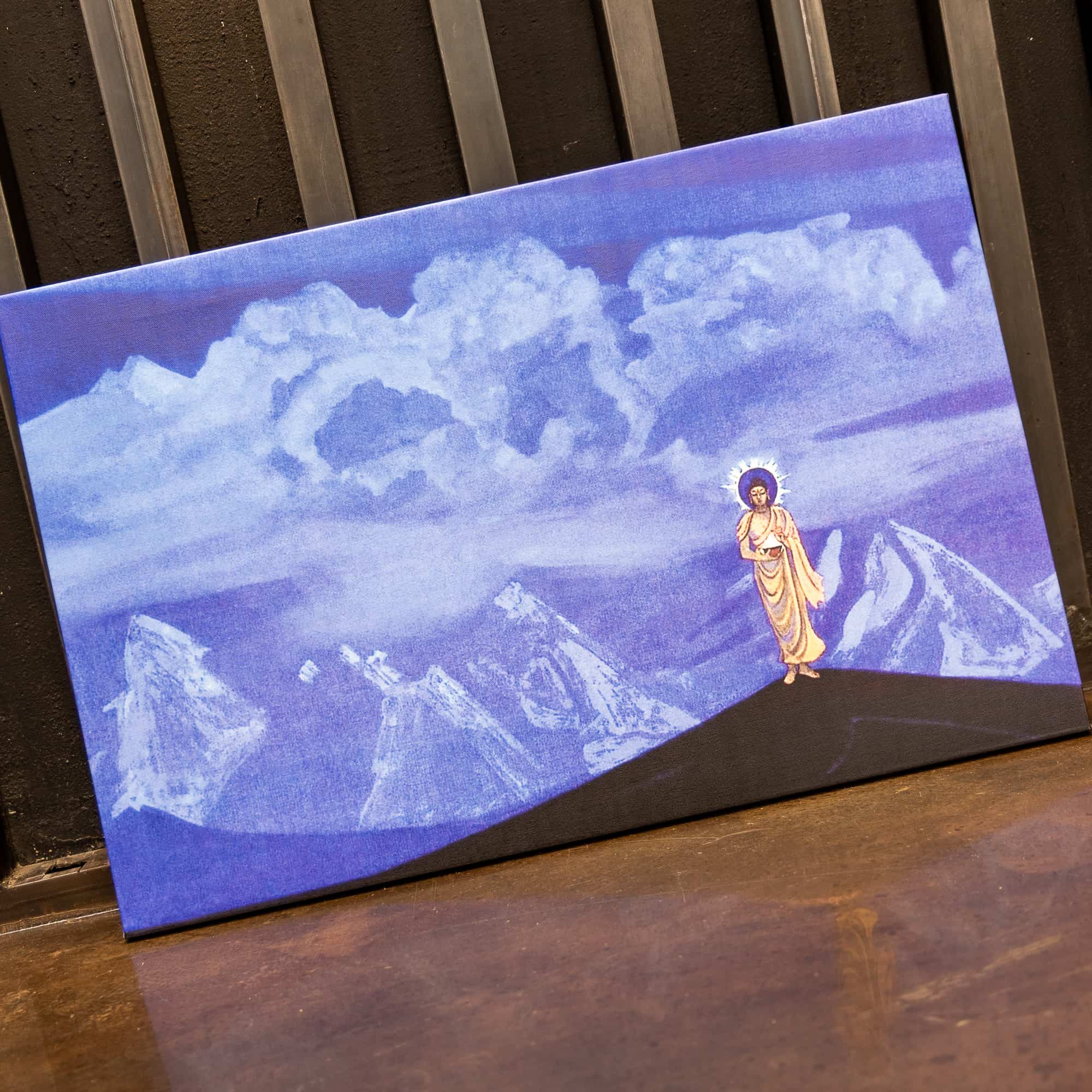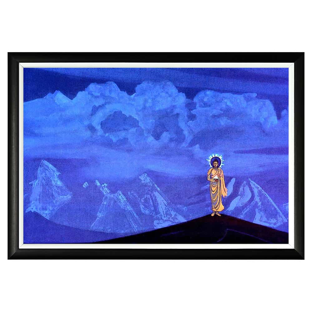 На картине движущиеся огромные кучевые облака противопоставляются острым горным пикам, что символизирует столкновение хаоса с Божественным мироустроением. Фигура Будды противопоставляется этому хаотическому потоку, решительно преобразуя пространство. Лик Благословенного глубоко сосредоточен, он окружён нимбом с вырывающимися из него лучами света и энергии. В его правой руке – пламенеющая Чаша.