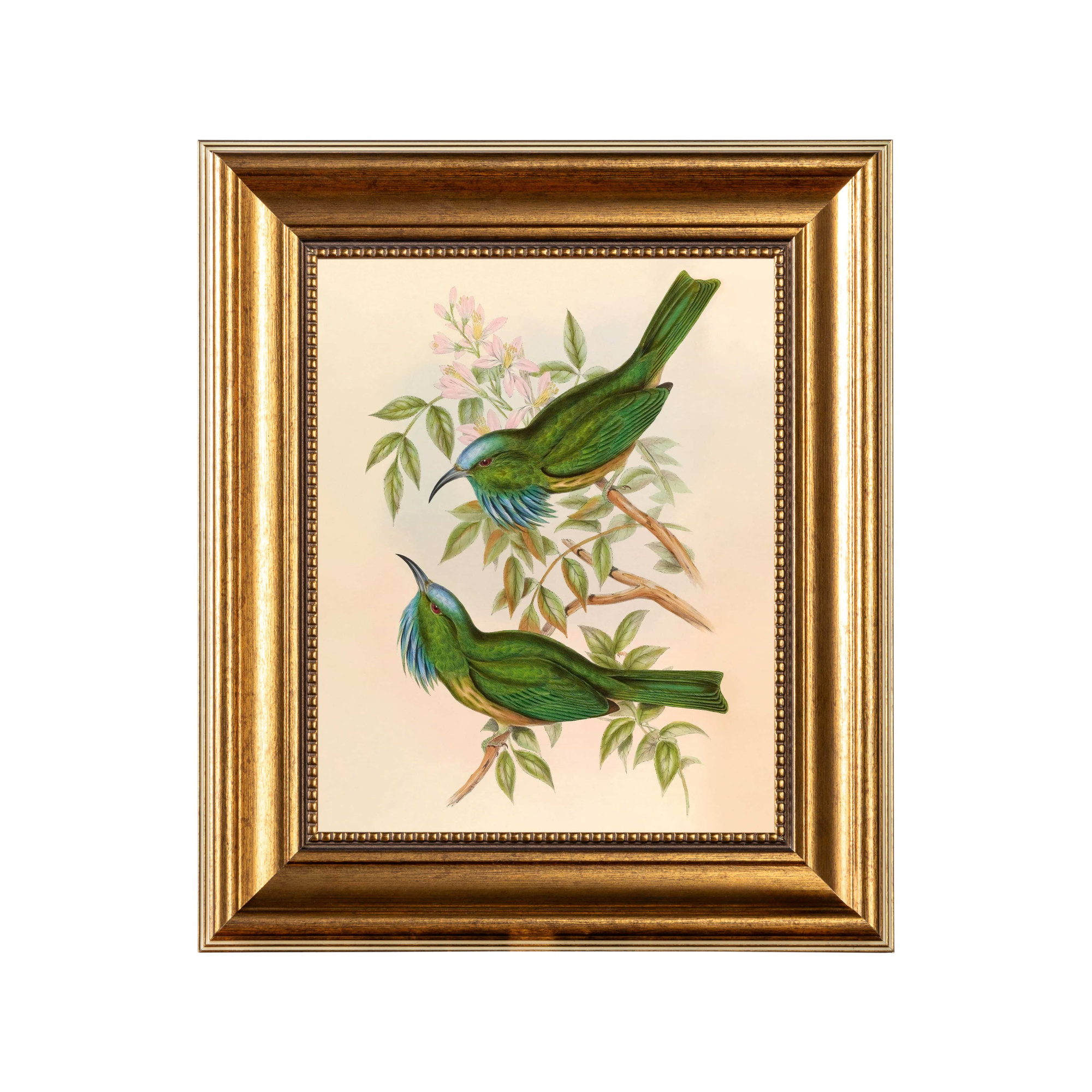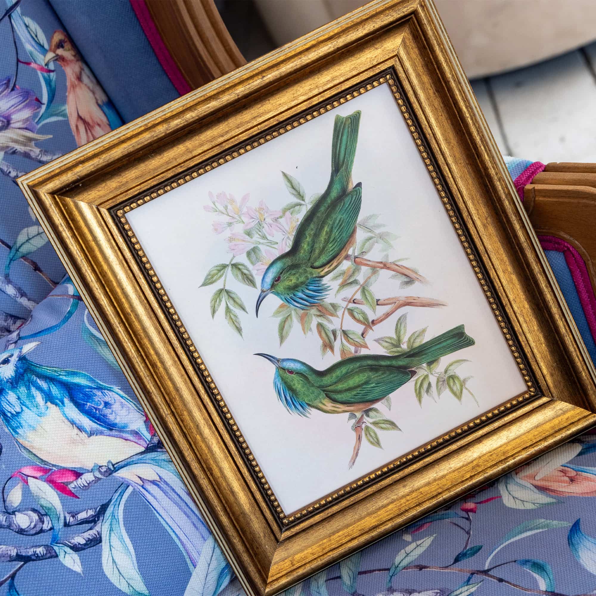 Среди изумрудной листвы, словно драгоценные камни, на картине «Серенити» расположились две яркие птицы с лазурными хохолками. Картина, озарённая золотистыми лучами и населённая этими райскими созданиями, станет изысканным акцентом вашего дома.