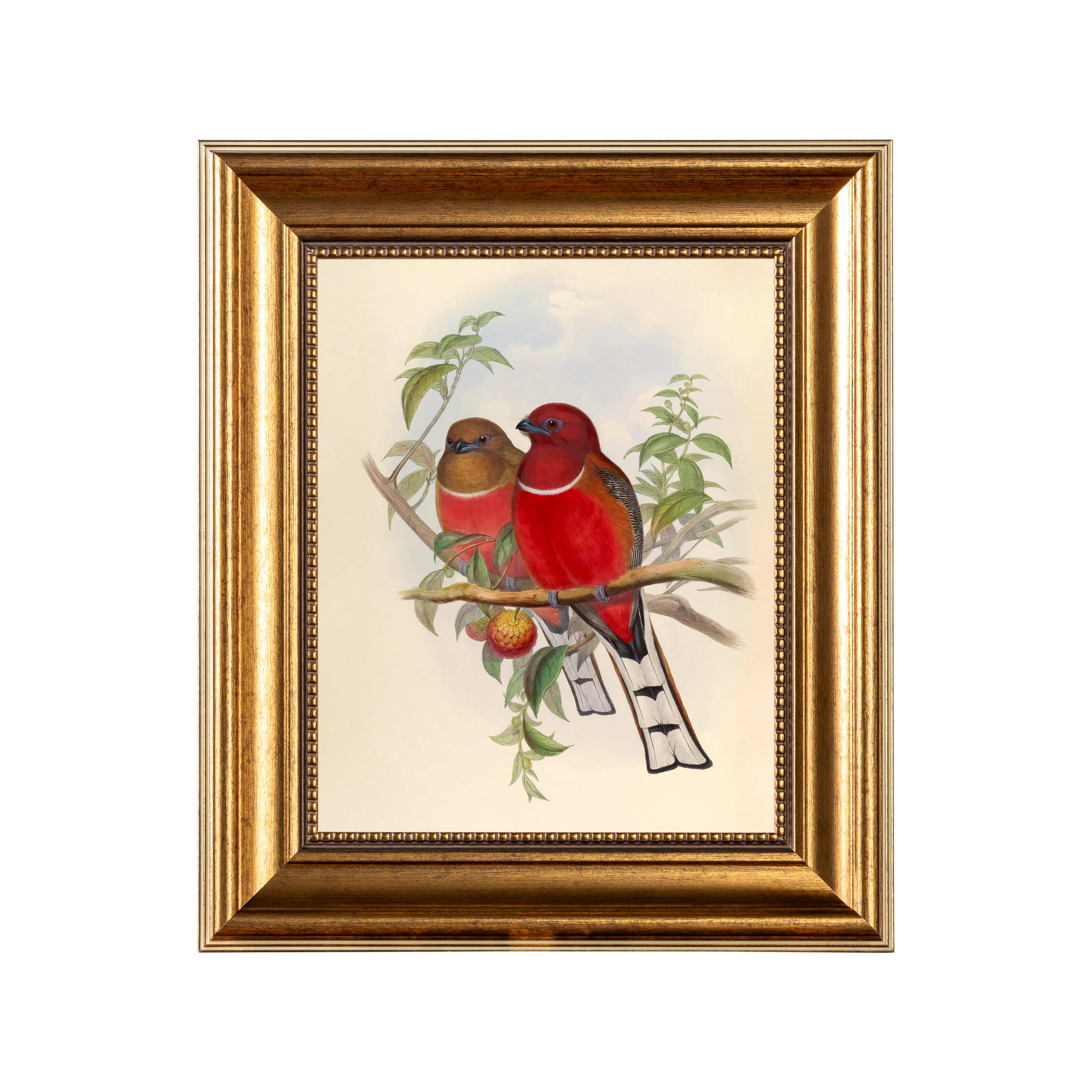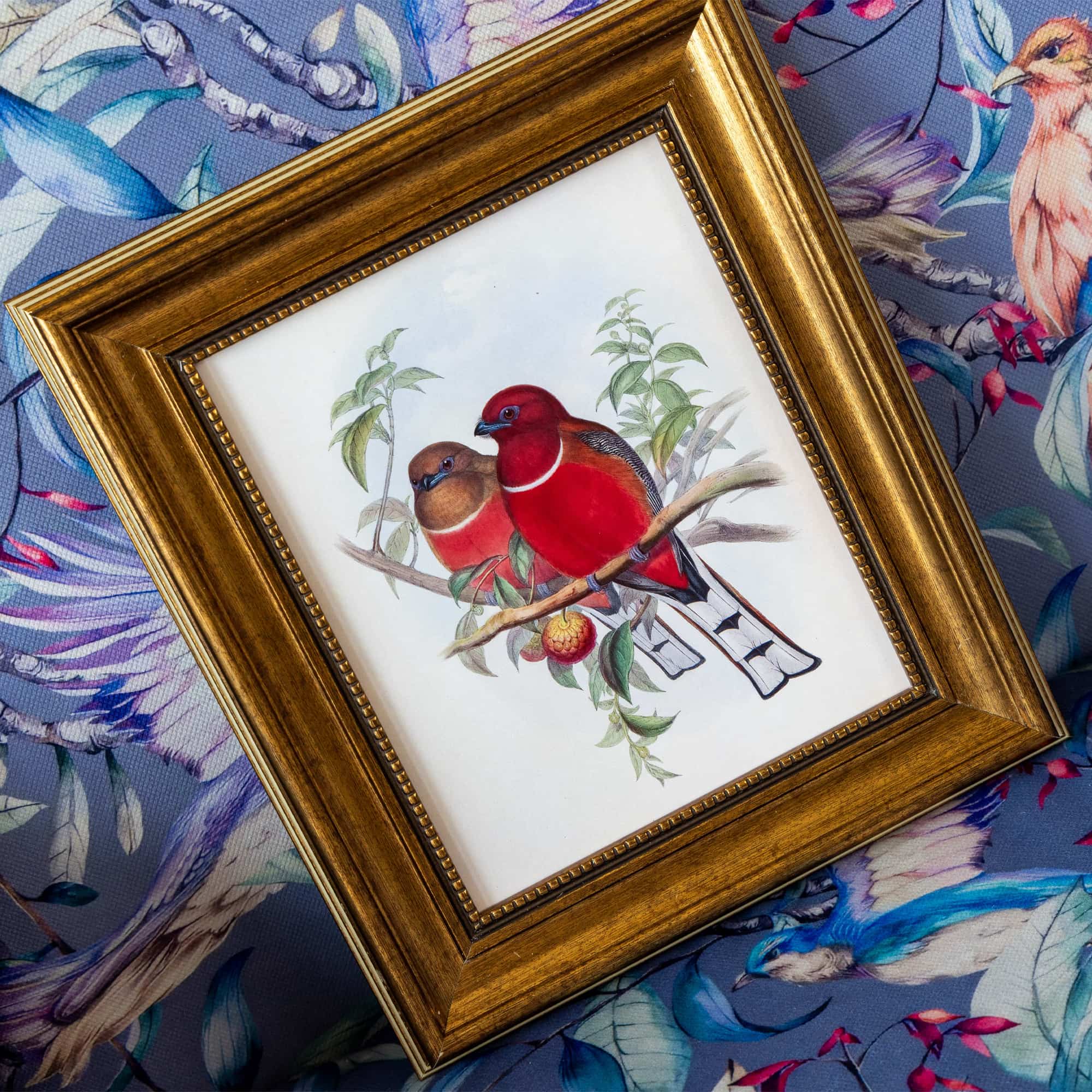 Две красногрудые птахи, два веселых посланника солнца, уютно расположились на ветке, словно сошедшие с полотен импрессионистов. Их дивную красоту подчеркивает изысканная рама, отливающая мягким, матовым золотом.