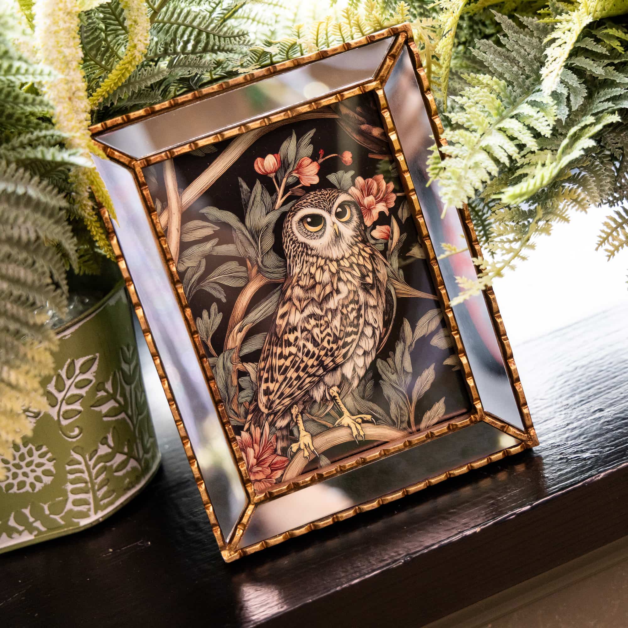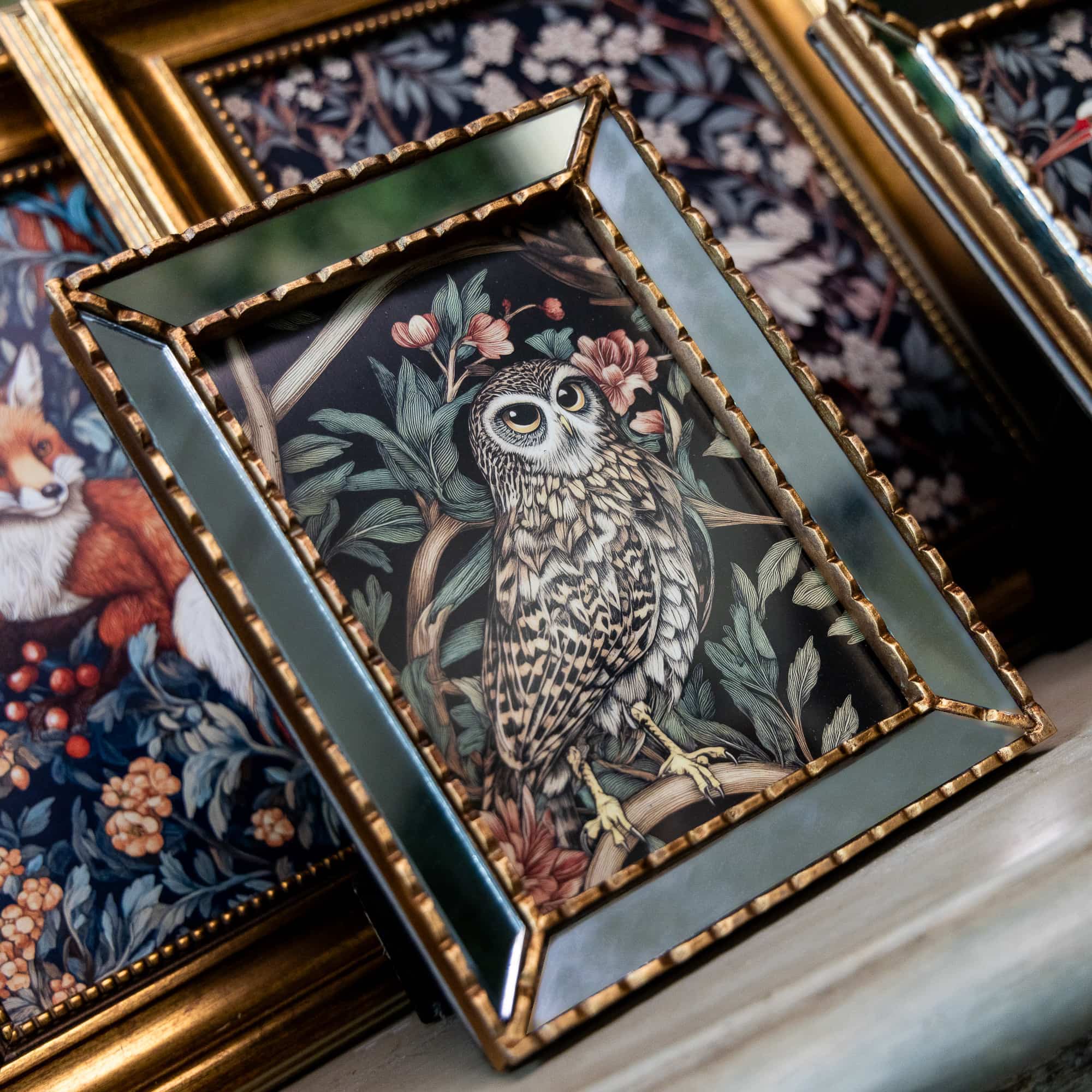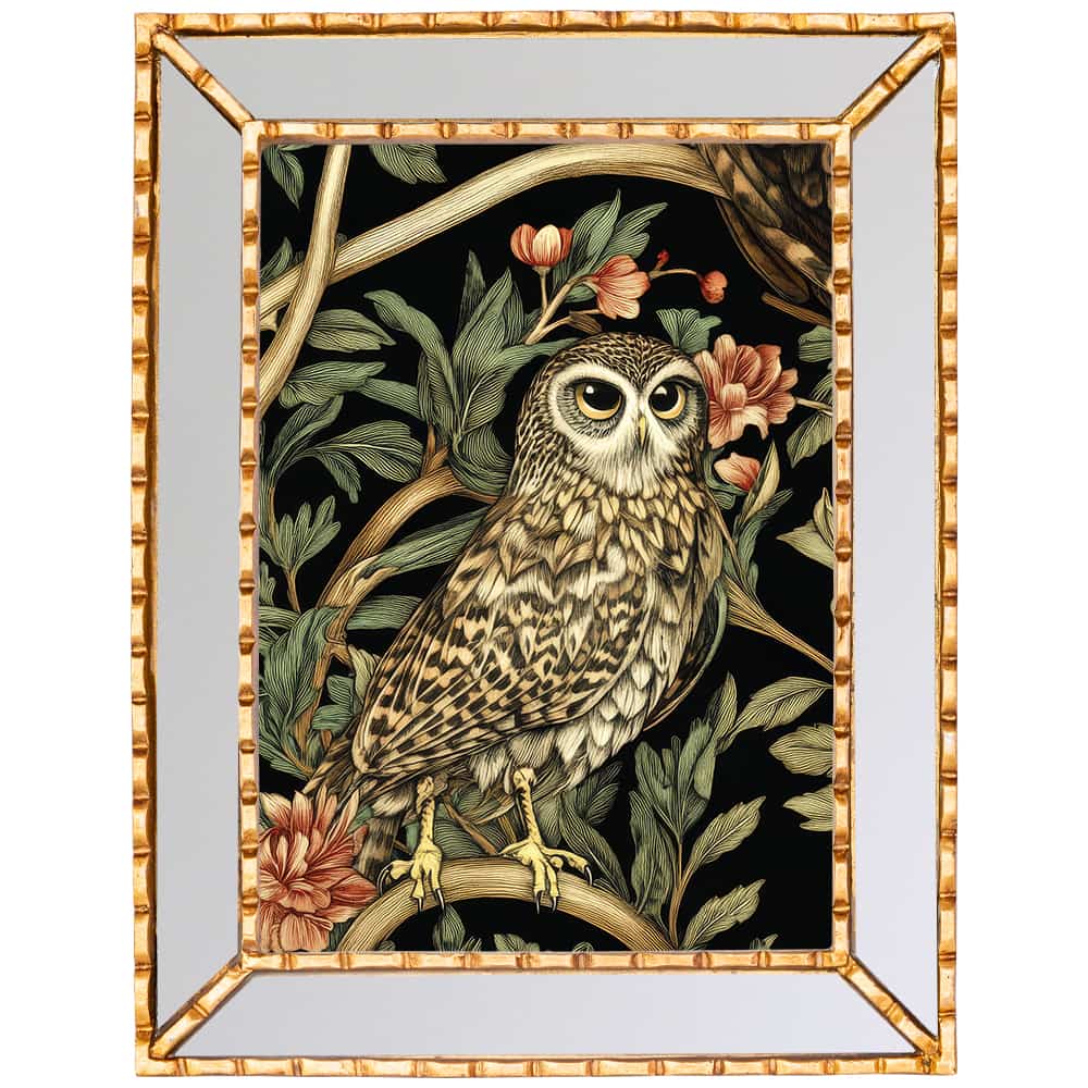 Мудрая сова с картины «Бал сказок», изготовленная в духе Уильяма Морриса, обретает новое очарование в зеркальной раме, превращающей картину в изысканный дизайнерский объект, полный таинственных отражений. Лучи солнца, играющие на зеркальной поверхности, словно приглашают в мир волшебства, где изображение сияет, множась в гранях отражений.