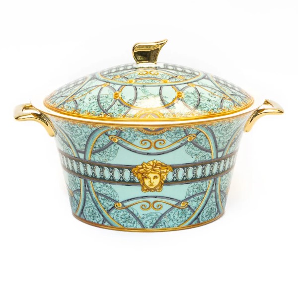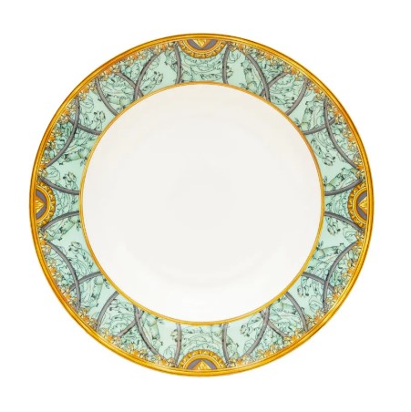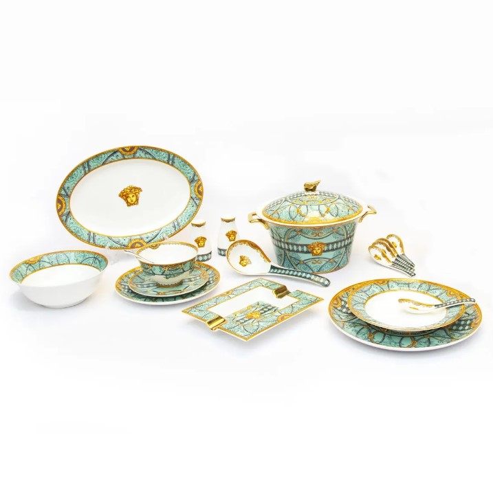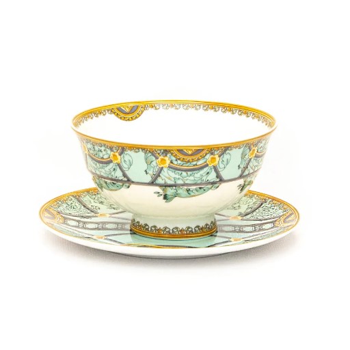 Столовый набор “Nefrit” – это сервиз с узорами в стиле барокко, выполненный в золотом цвете, расположенный на спокойном фоне в пастельной гамме и дополненный золотой каймой, которая элегантно опоясывает каждый предмет сервиза.