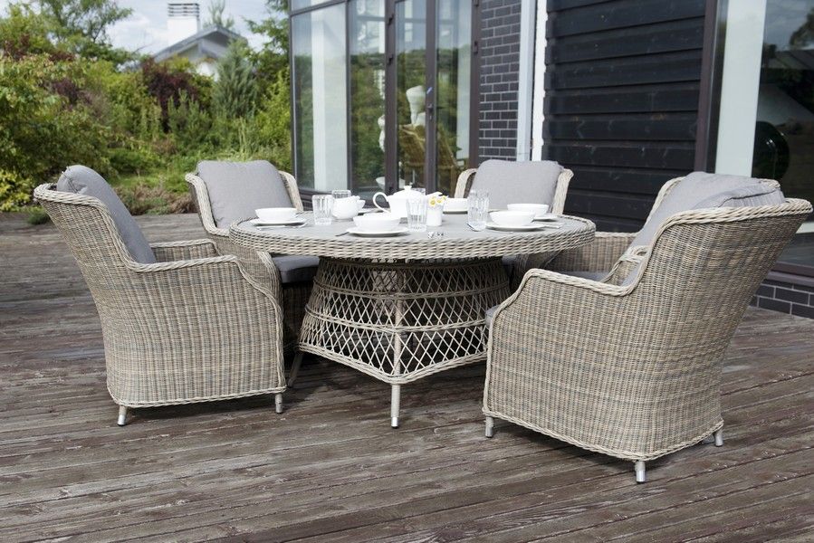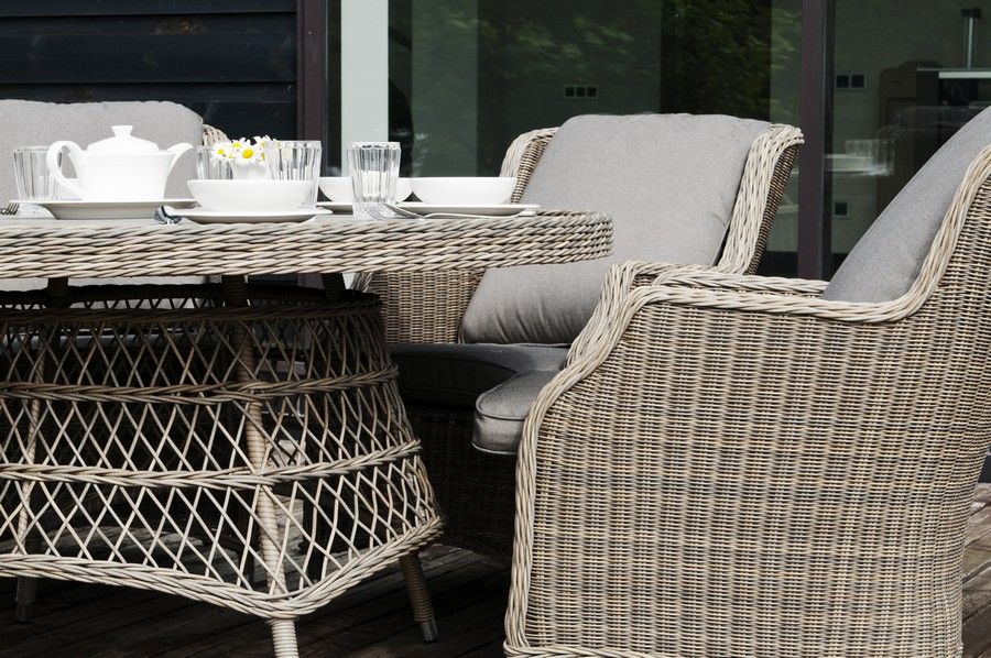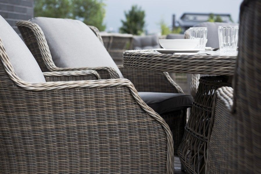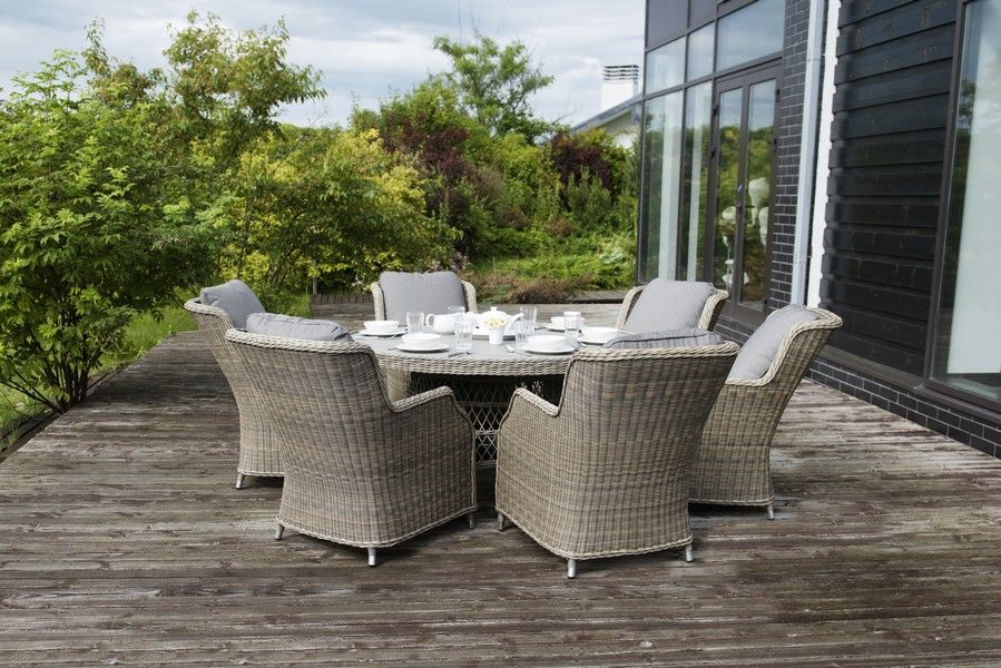Столешница изготовлена из полимерного материала ДПК, устойчивого к ультрафиолетовым лучам и декорированным под дерево. Плетеные стулья для удобства использования оснащены подлокотниками и подушками серого цвета на спинках и сидениях. Ткань обработана влагоотталкивающей пропиткой. -