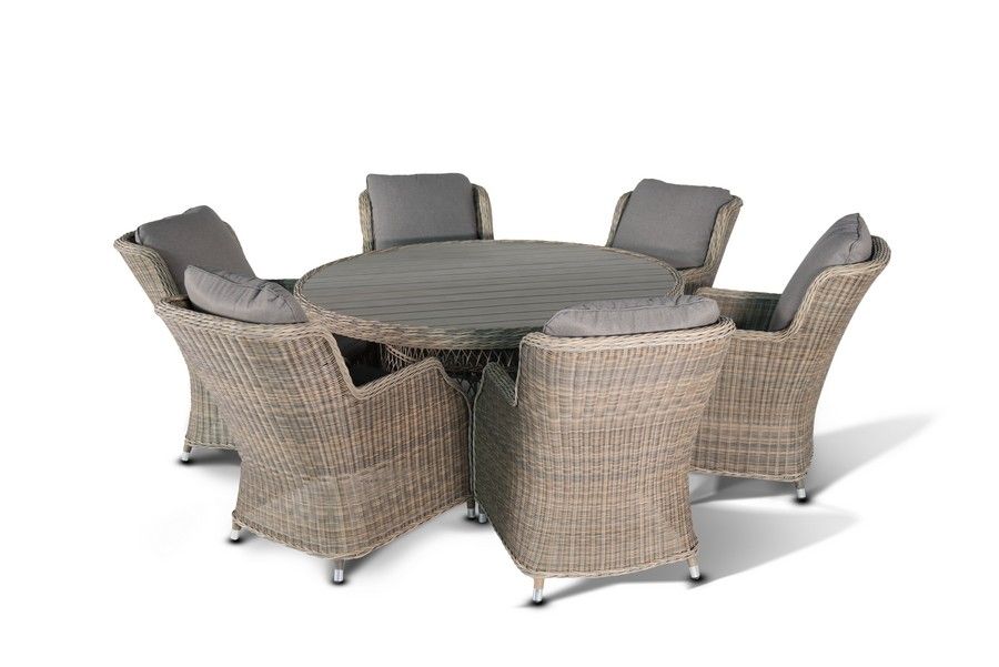 Премиальная обеденная группа «Неаполь» на 6 персон. В наборе: большой круглый обеденный стол (1520×1520×740 мм) и 6 стульев (900×650×920 мм).