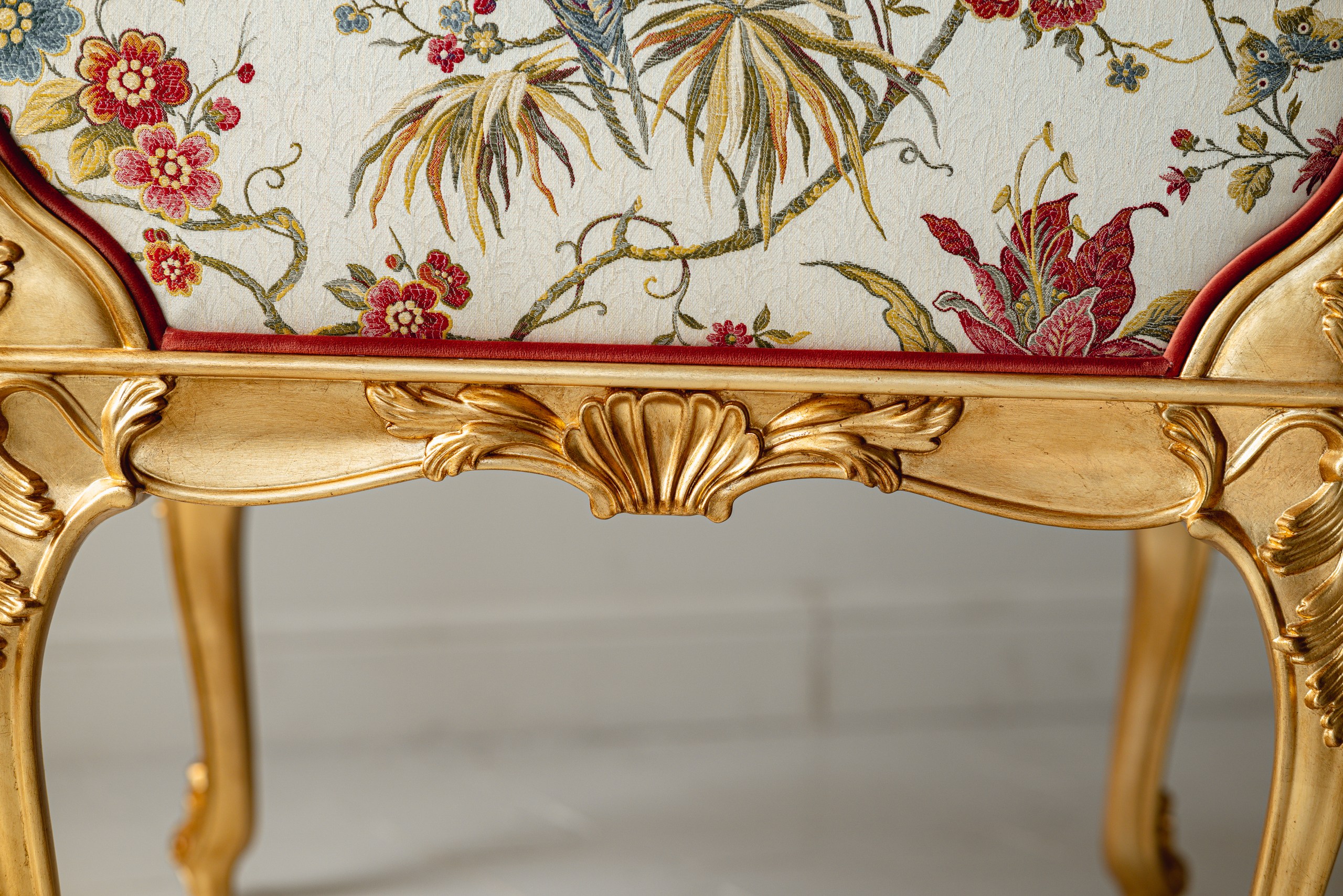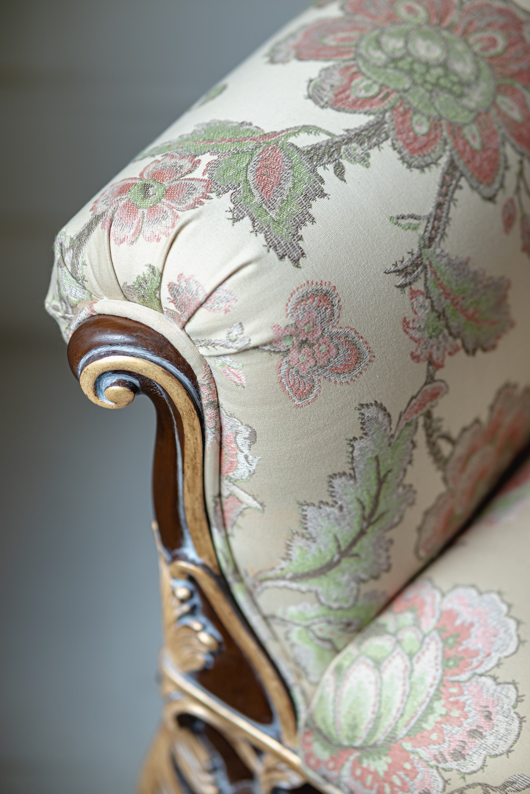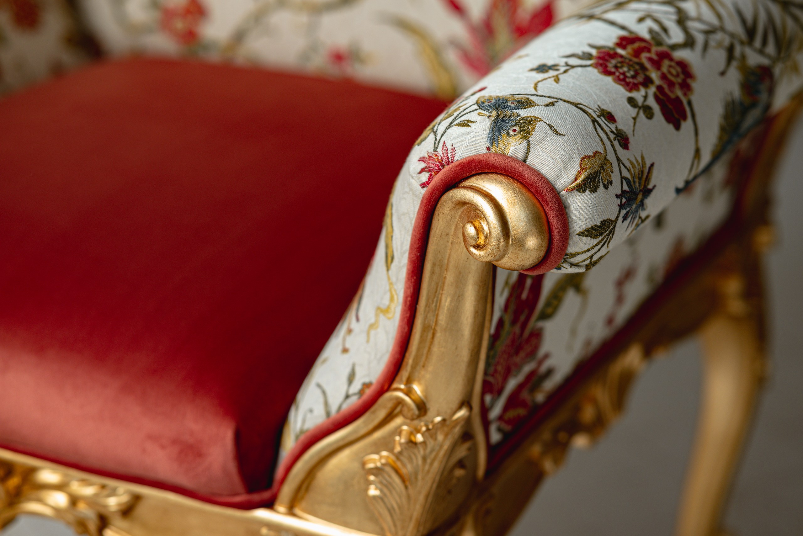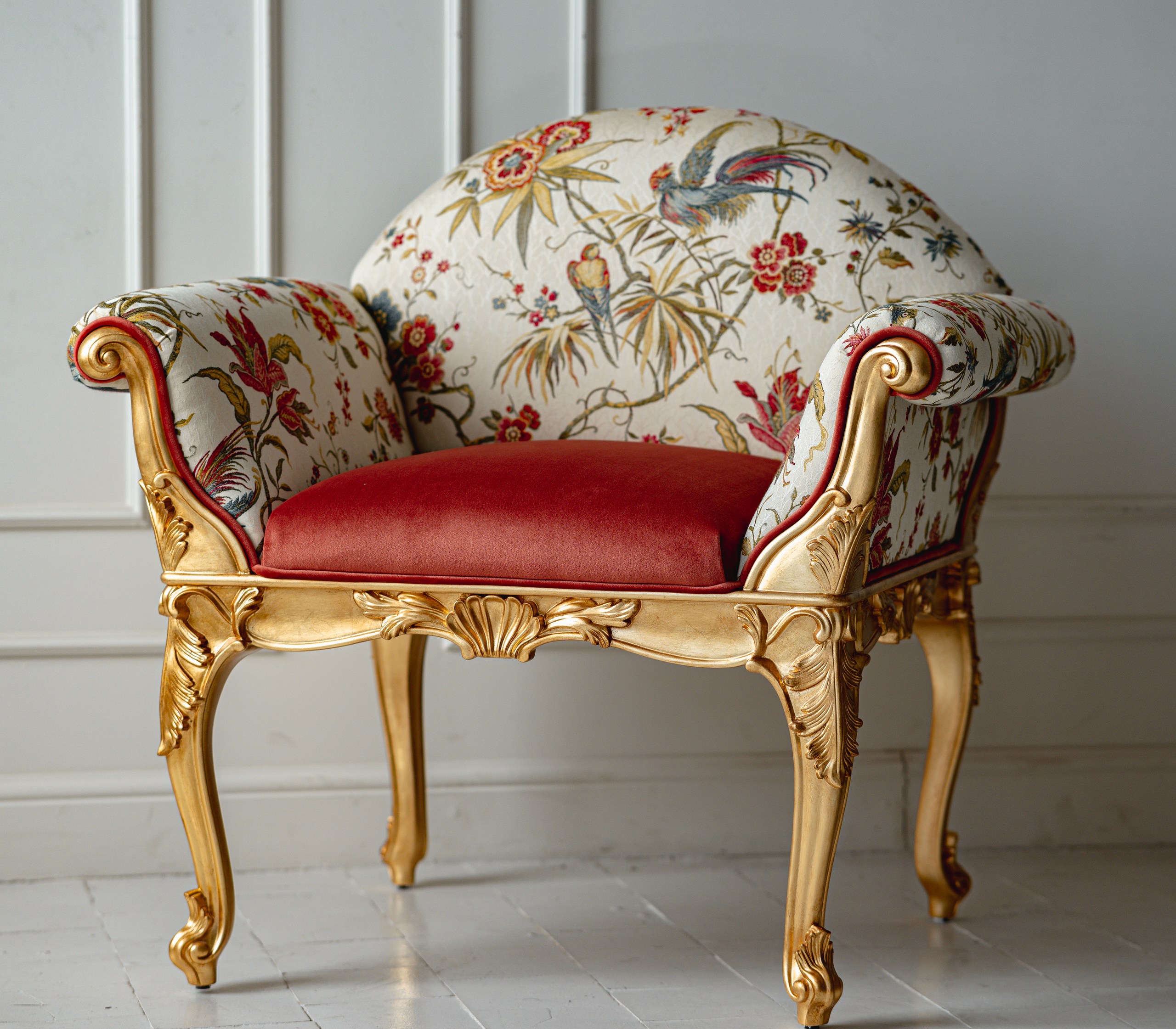 Выбор обивки и отделки: Стоимость указана для обивки однотонным велюром. Доступен выбор из широкого ассортимента тканей и кожзаменителей высшего качества. Отделка деревянных элементов краской или поталью обсуждается индивидуально.