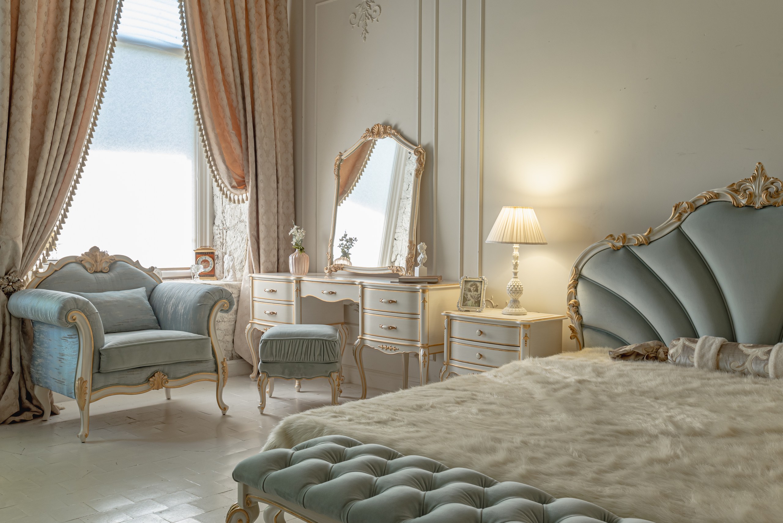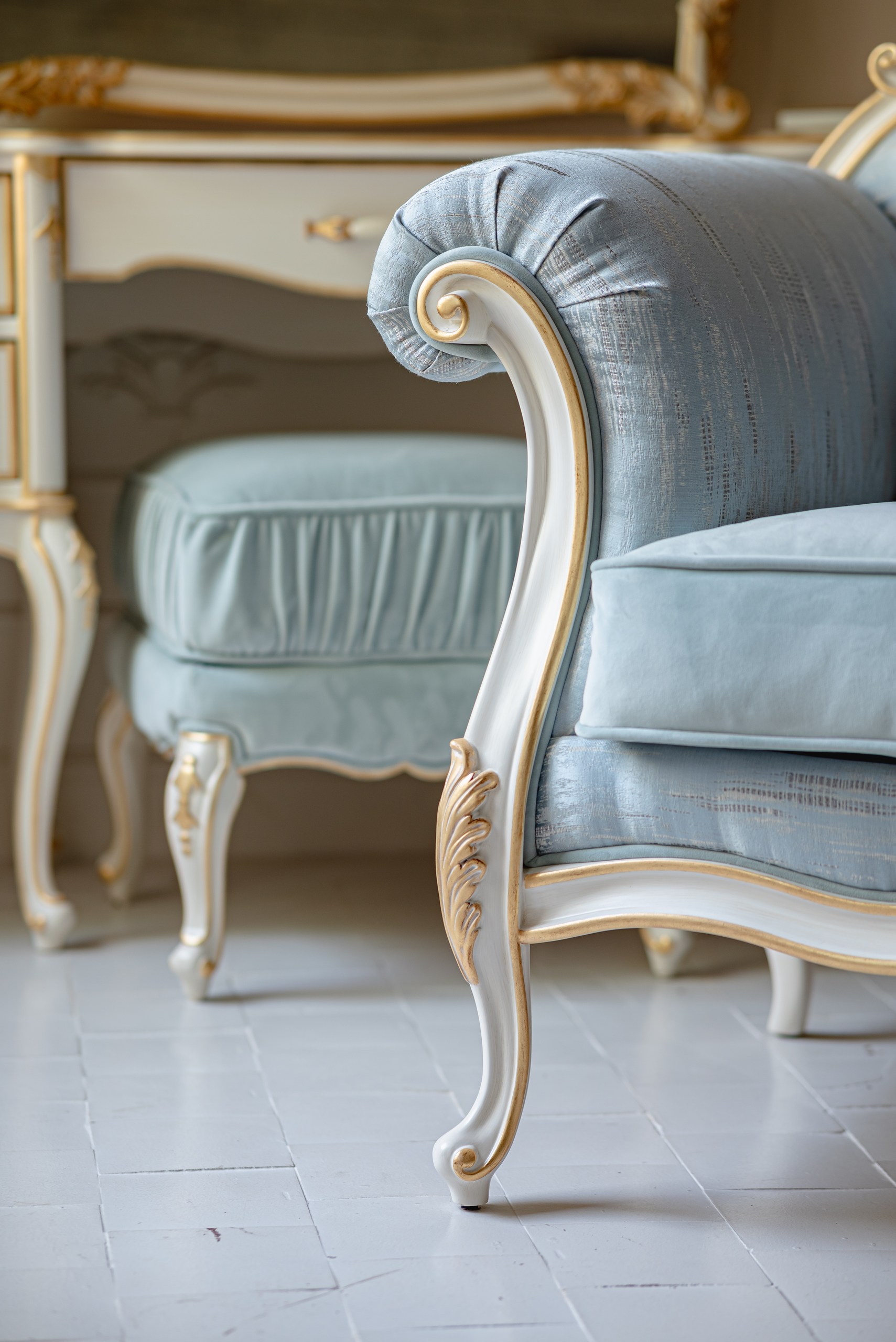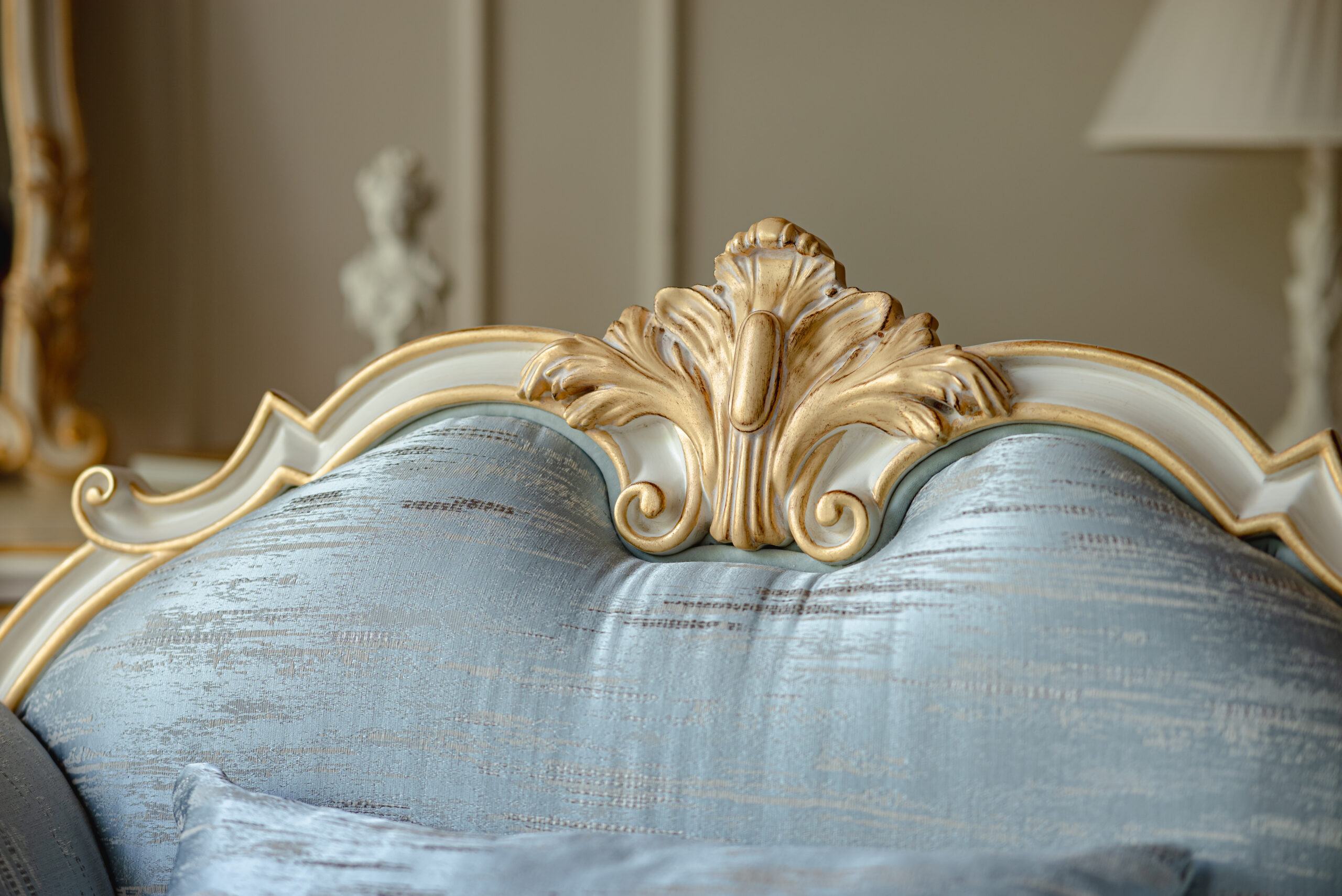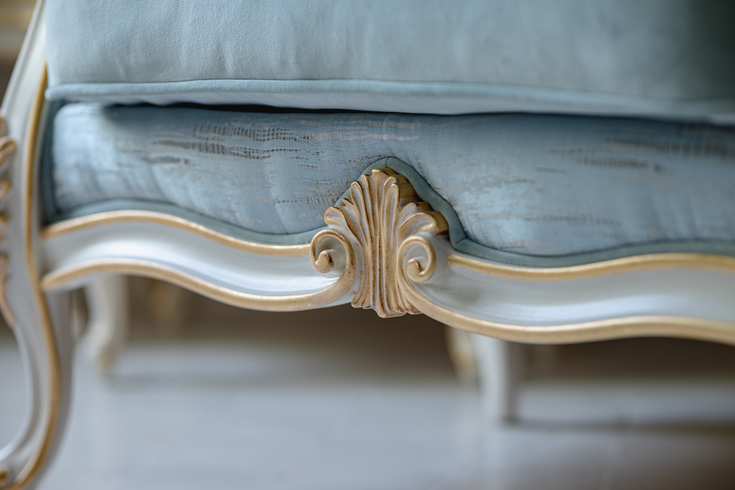 Выбор обивки и отделки дерева: Обивка стандартным велюром входит в базовую стоимость. Выбор альтернативных тканей, а также типа резьбы, тонировки и декоративной отделки массива (патина, позолота) является важнейшей частью создания эксклюзивного изделия.