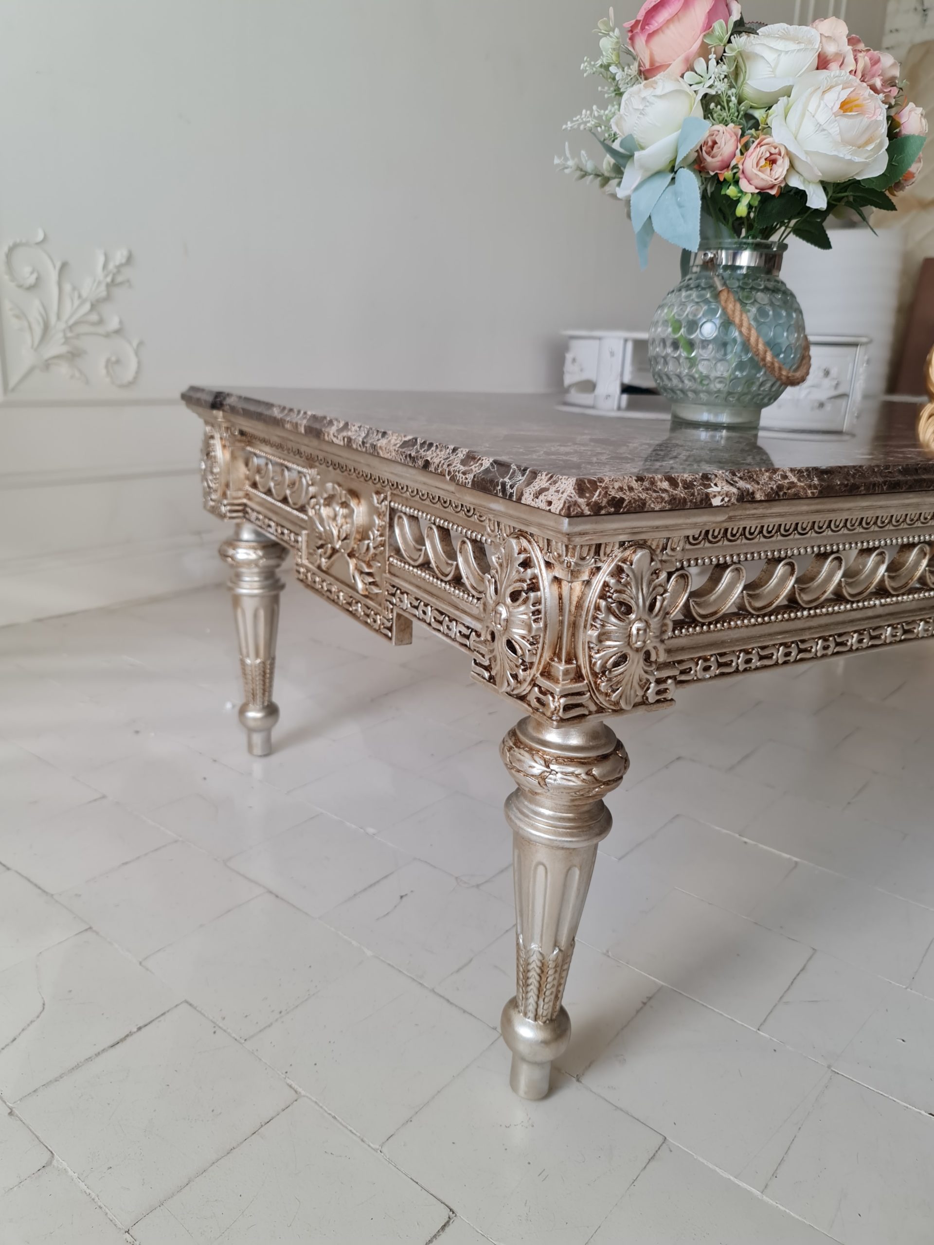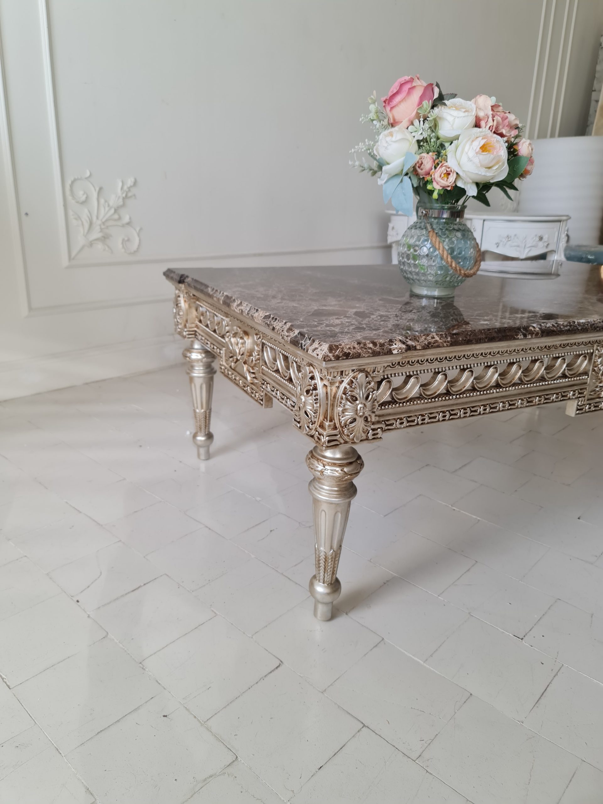 Дополнительная услуга премиум-класса «Эксклюзив»: изготовление и установка фигурной мраморной столешницы, в точности повторяющей контур ножек и изгибы модели. Это высший пилотаж, превращающий столик в уникальное произведение. Стоимость — 47 500 рублей.