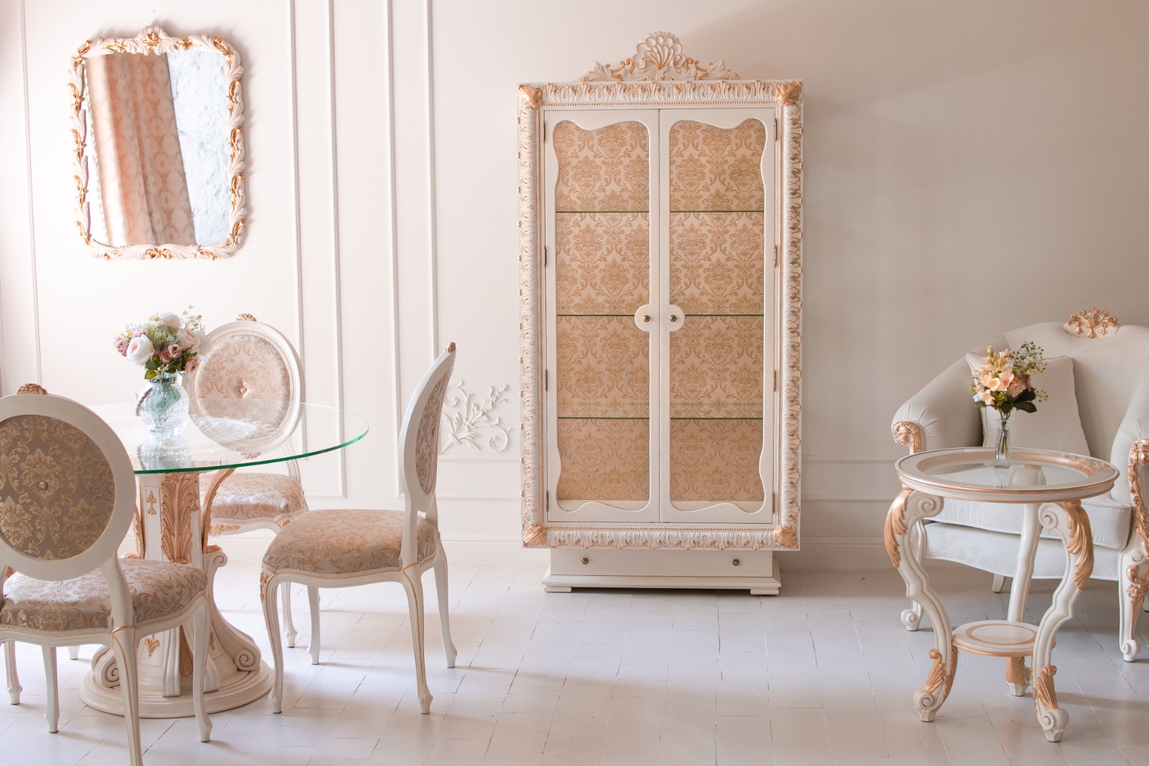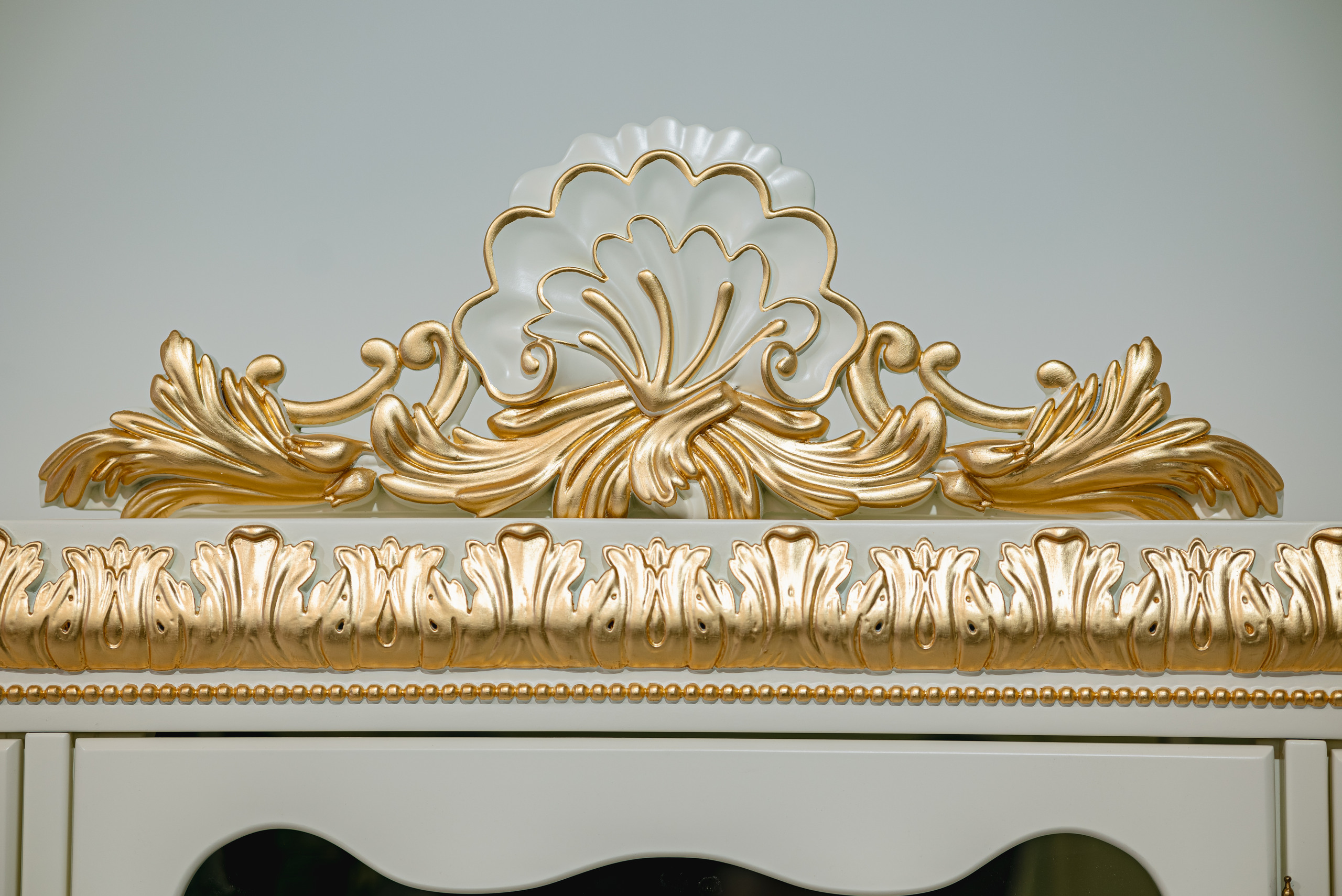 Декоративные элементы — карниз, пилястры, молдинги, обрамляющие стеклянные секции, — изготовлены из итальянского мебельного полиуретана. Этот материал позволяет создавать длинные, идеально ровные детали сложного профиля, которые не деформируются со временем и служат надежным, легким обрамлением для стекла.