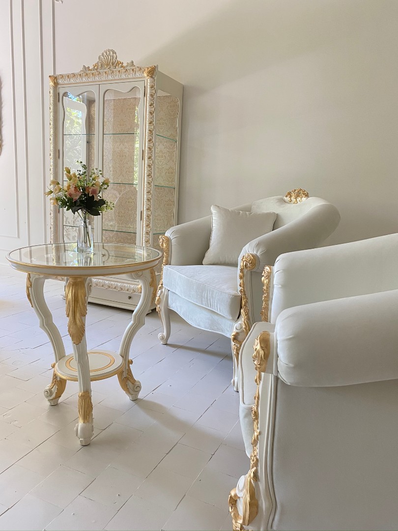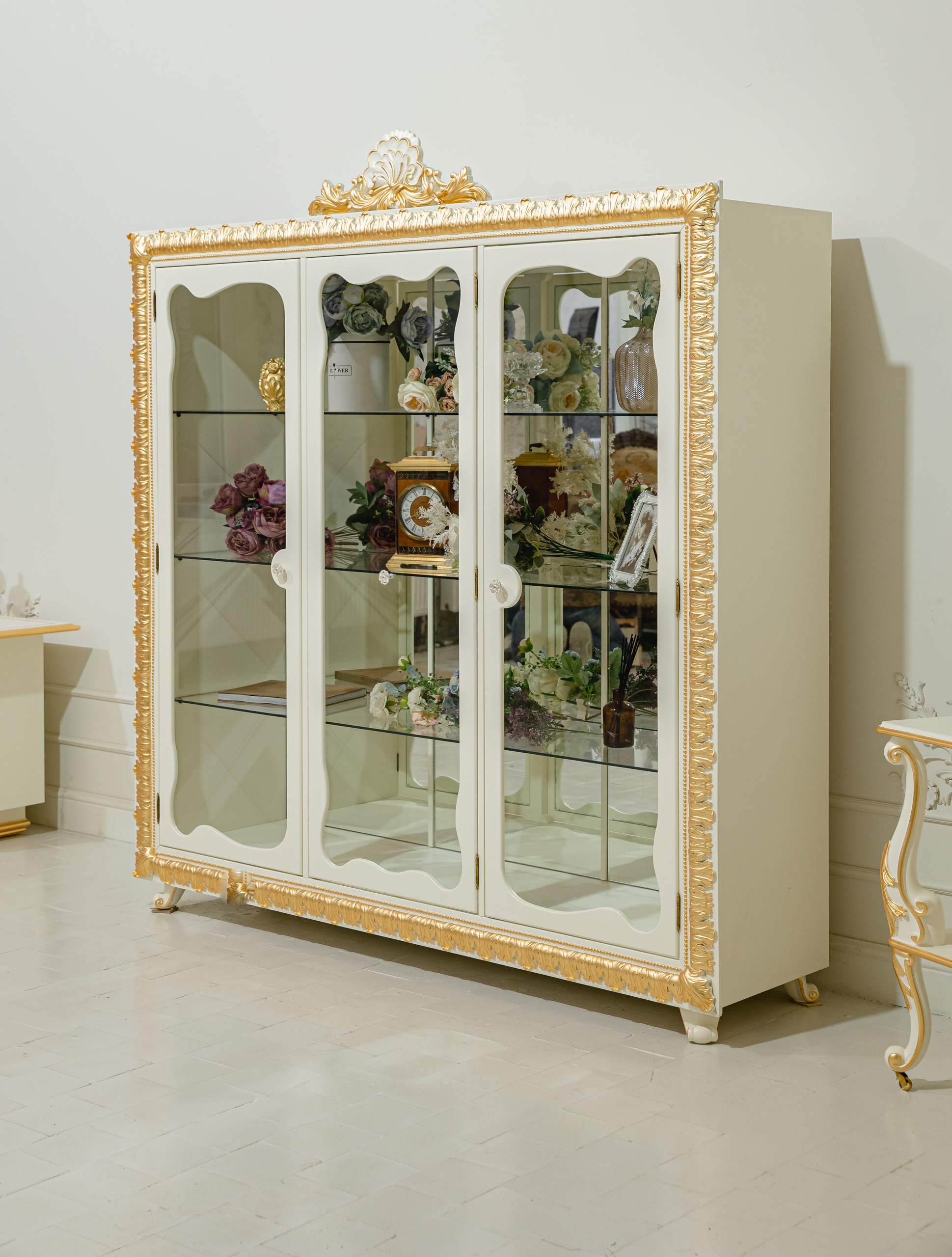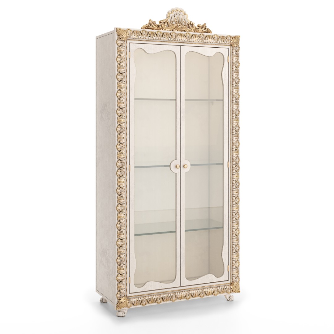 - Материалы: МДФ, многослойная березовая фанера (корпус). Итальянский мебельный полиуретан (лепной декор). Закаленное стекло в фасадах.
