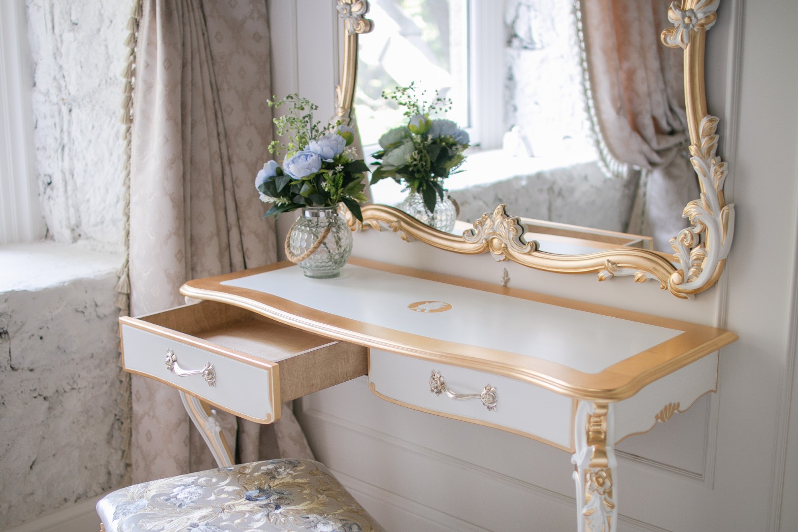 Консоль Беатрис создана из комбинации лучших материалов. За стабильность и прочность каркаса отвечает высококачественный МДФ. Выдвижные ящики изготовлены из многослойной березовой фанеры — материала, известного своей исключительной прочностью, устойчивостью к деформациям и идеально ровной поверхностью. Это гарантирует плавный ход ящиков и их долгий срок службы. Изящный декор, включая фигурные ножки и накладки, выполнен из итальянского мебельного полиуретана, который позволяет воспроизводить сложные рельефы с филигранной точностью.