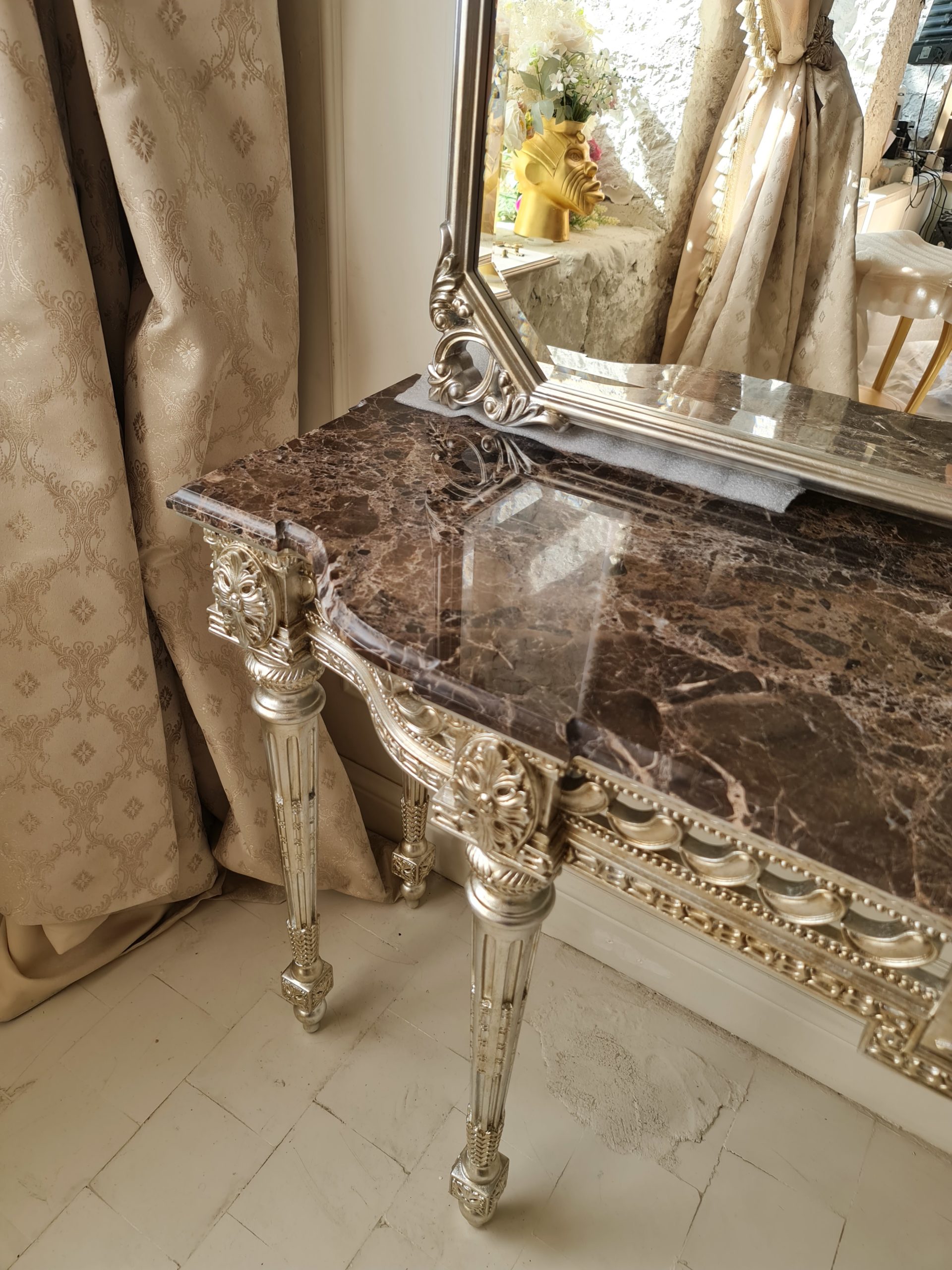 - Потенциал для создания абсолютно уникального произведения. В паре с фигурной мраморной столешницей консоль превращается в целостную скульптуру, изготовление которой является вызовом даже для опытных мастеров.
