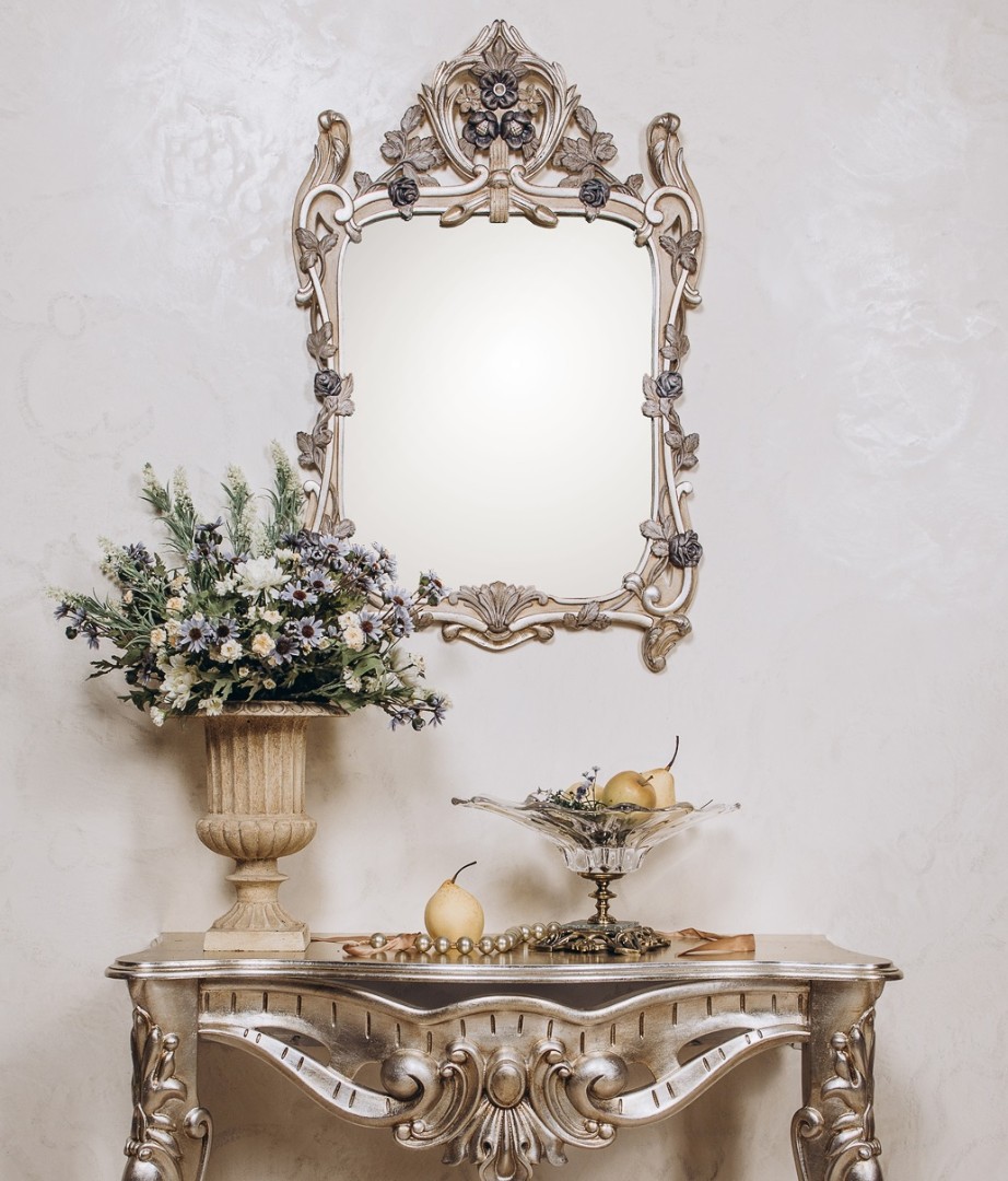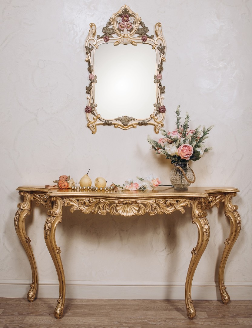 Главный парадокс и очарование «МаПетита» — в контрасте между его небольшими внешними габаритами и невероятной насыщенностью лепного декора. Каждый сантиметр рамы тщательно проработан: растительные мотивы, завитки, раковины и картуши создают сложную, многослойную композицию. При этом вы сохраняете право выбора любого цвета отделки без увеличения стоимости, что позволяет идеально вписать этот интенсивный декор в вашу цветовую палитру.