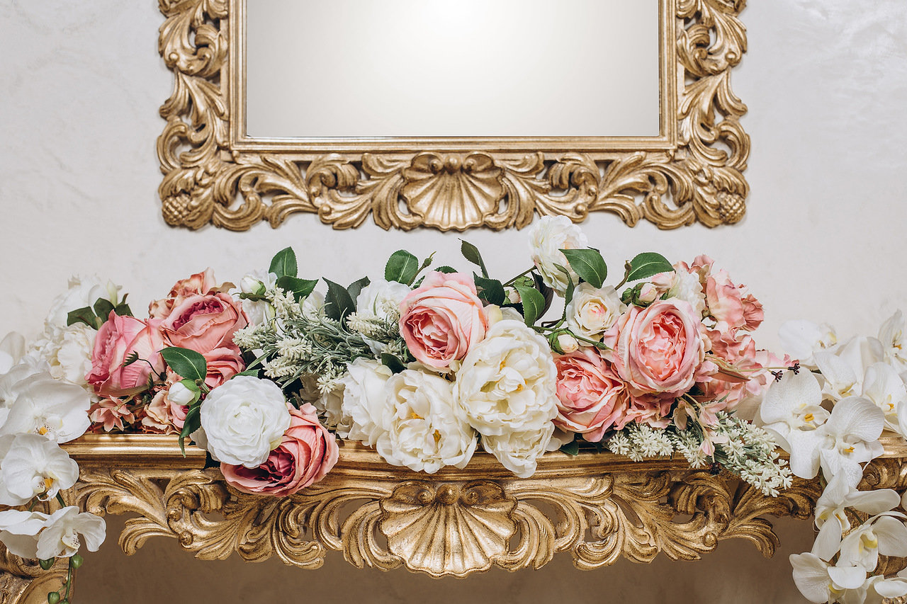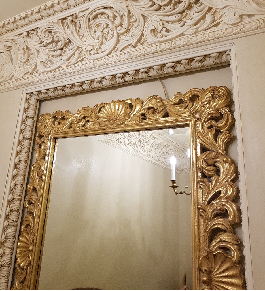 Рама зеркала отлита из итальянского мебельного полиуретана — материала, который по праву считается эталоном в создании лепного декора. Он воспроизводит мельчайшие детали с музейной точностью, оставаясь при этом невероятно практичным.