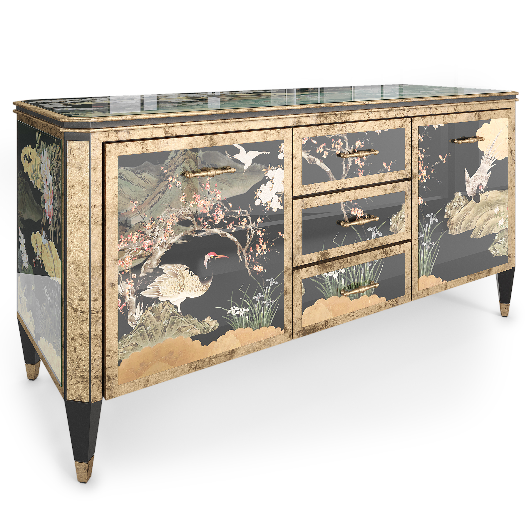 Особая гордость этой модели — полное погружение в искусство. Боковые стенки, столешница и фасады ящиков и дверей украшены не печатью, а настоящим художественным стеклом. Его обратная сторона вручную декорируется металлической фольгой по старинной технике Эгломизе.
