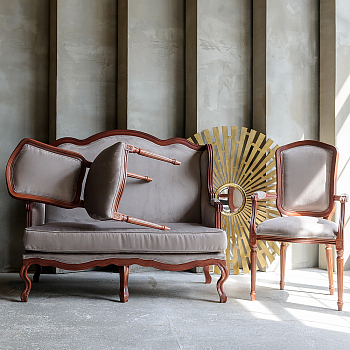 В гарнитуре «Вечные ценности» мебель гармонирует единым стилем, цветом обивки и древесины. Коллекция включает также двухместный диван, большое кресло и стул.