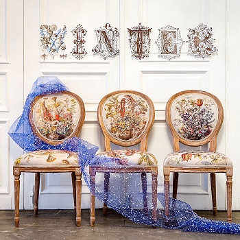 Коллекционную компанию стулу составят кресла, галерея декоративных подушек, столовых полотенец и репродукций, повторяющих букеты цветочного календаря.