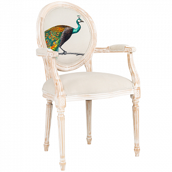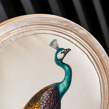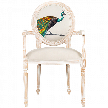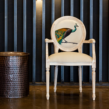 В основе дизайна полукресла – старинная гравюра на холсте «Величественно окрашенный портрет павлина», написанная французским художником Эдуардом Травье де Виллер (Edouard Travies).
