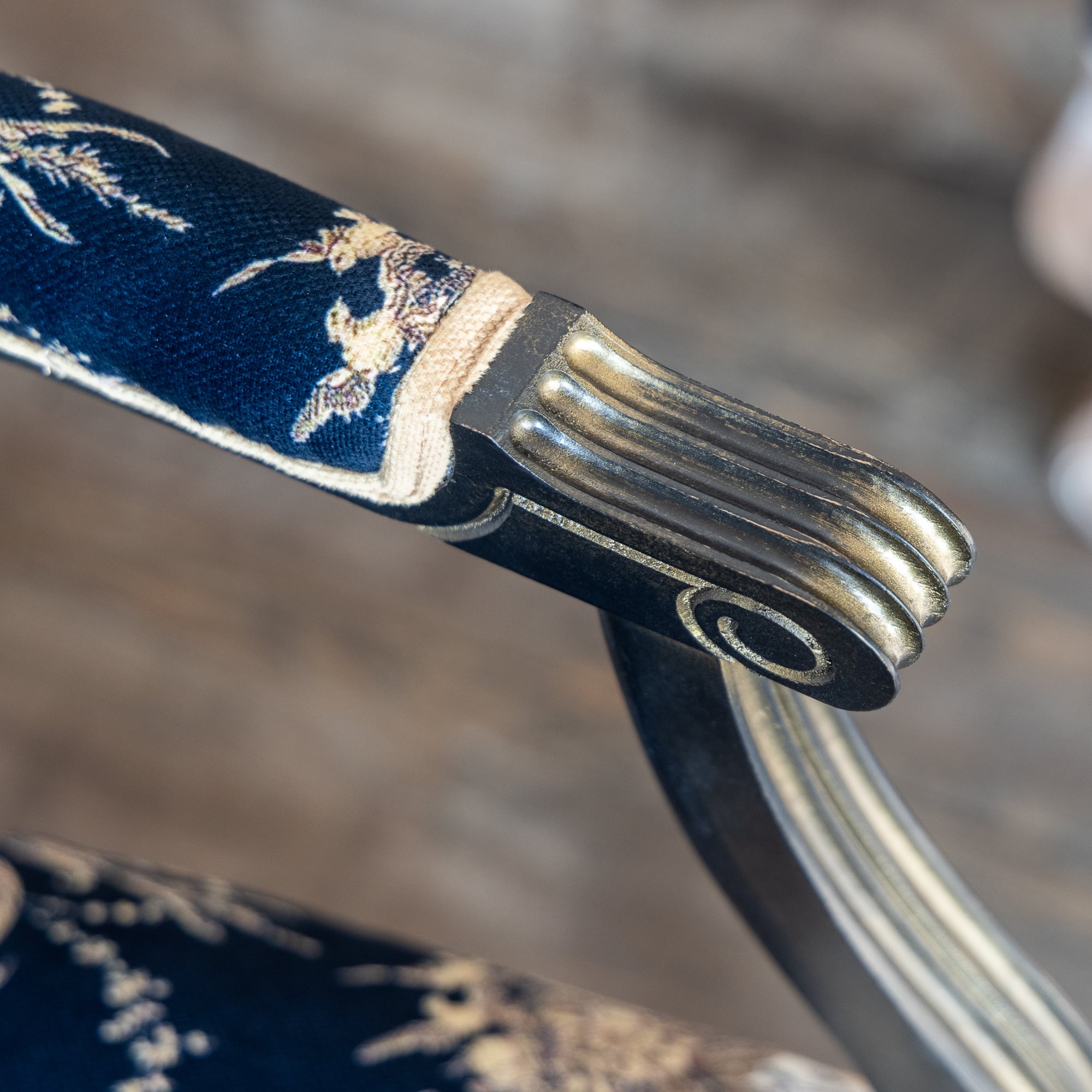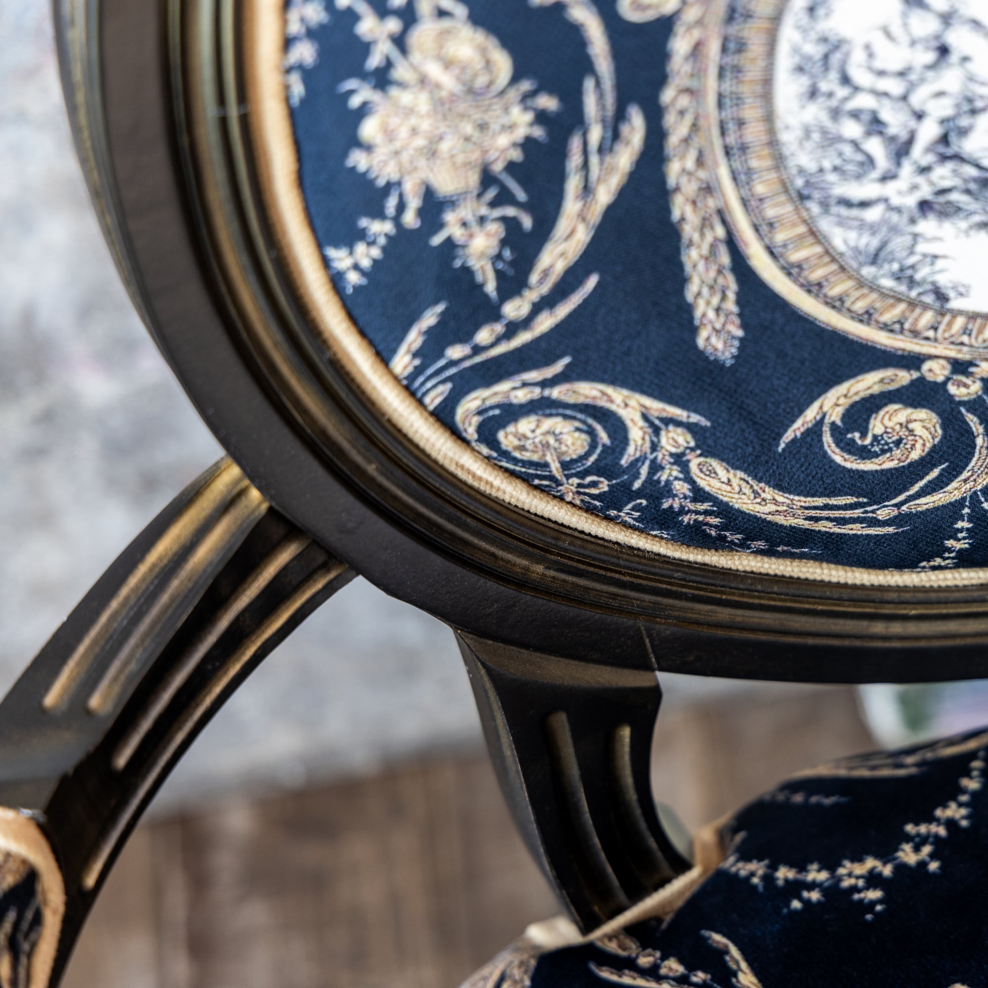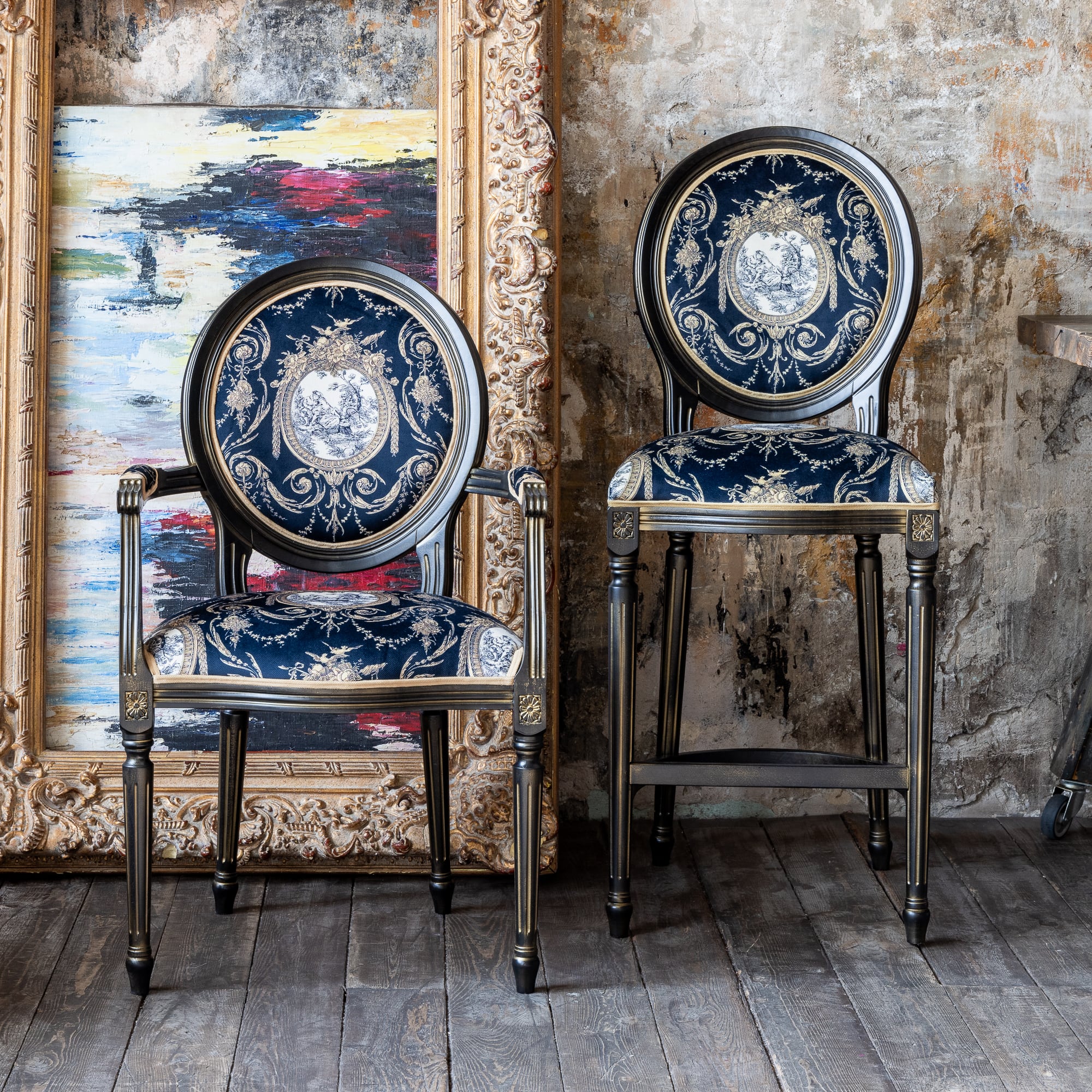 Каркас из натуральной древесины с великолепной резьбой и черно-золотая бархатистая ткань создают удивительно изысканный и в то же время комфортный мебельный экземпляр, способный украсить собой любое помещение и привнести в него атмосферу роскоши и грандиозности прошлых эпох.