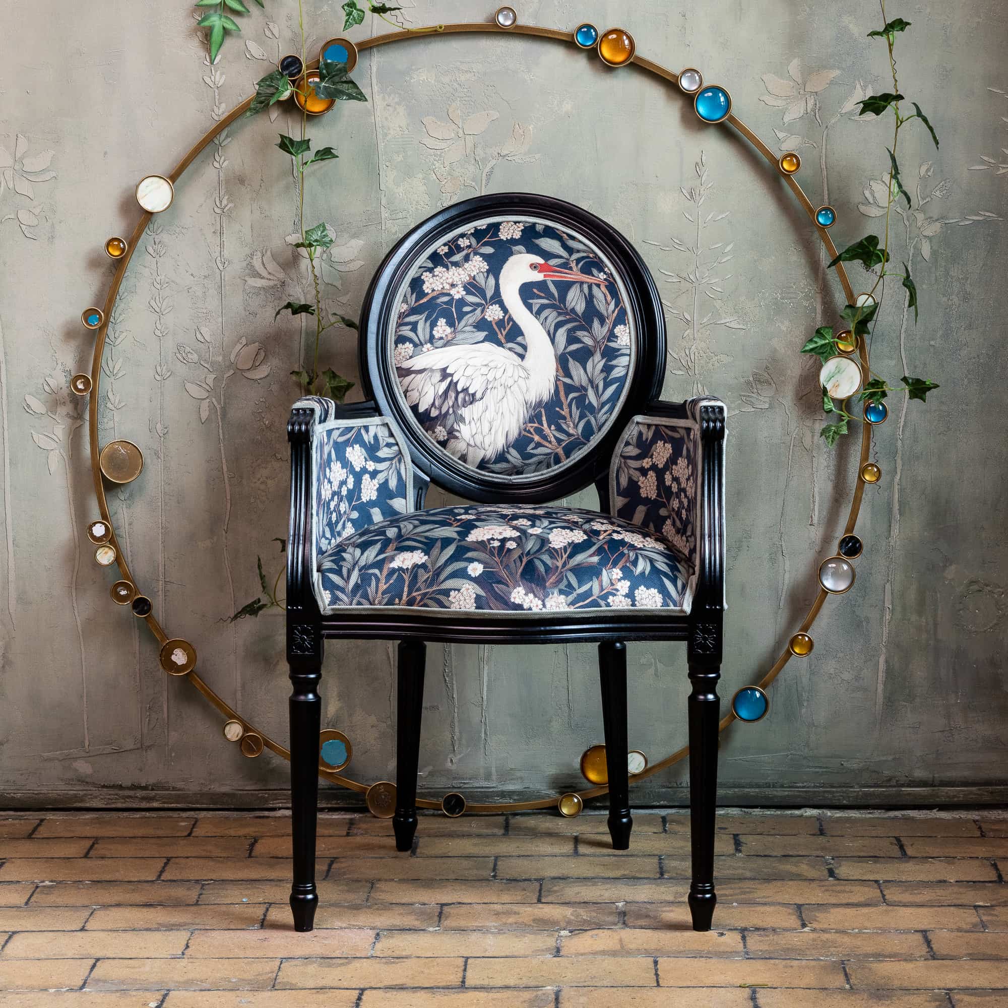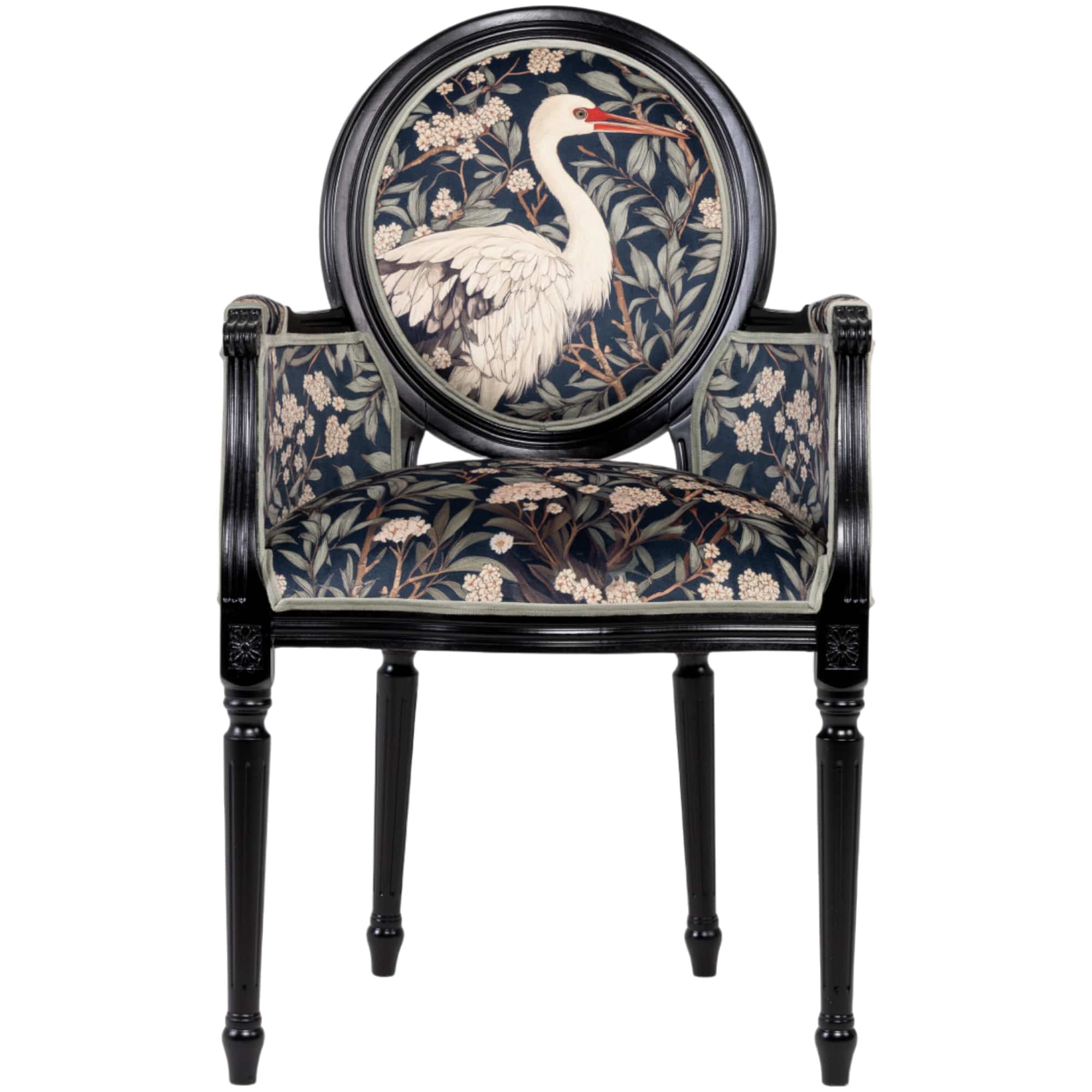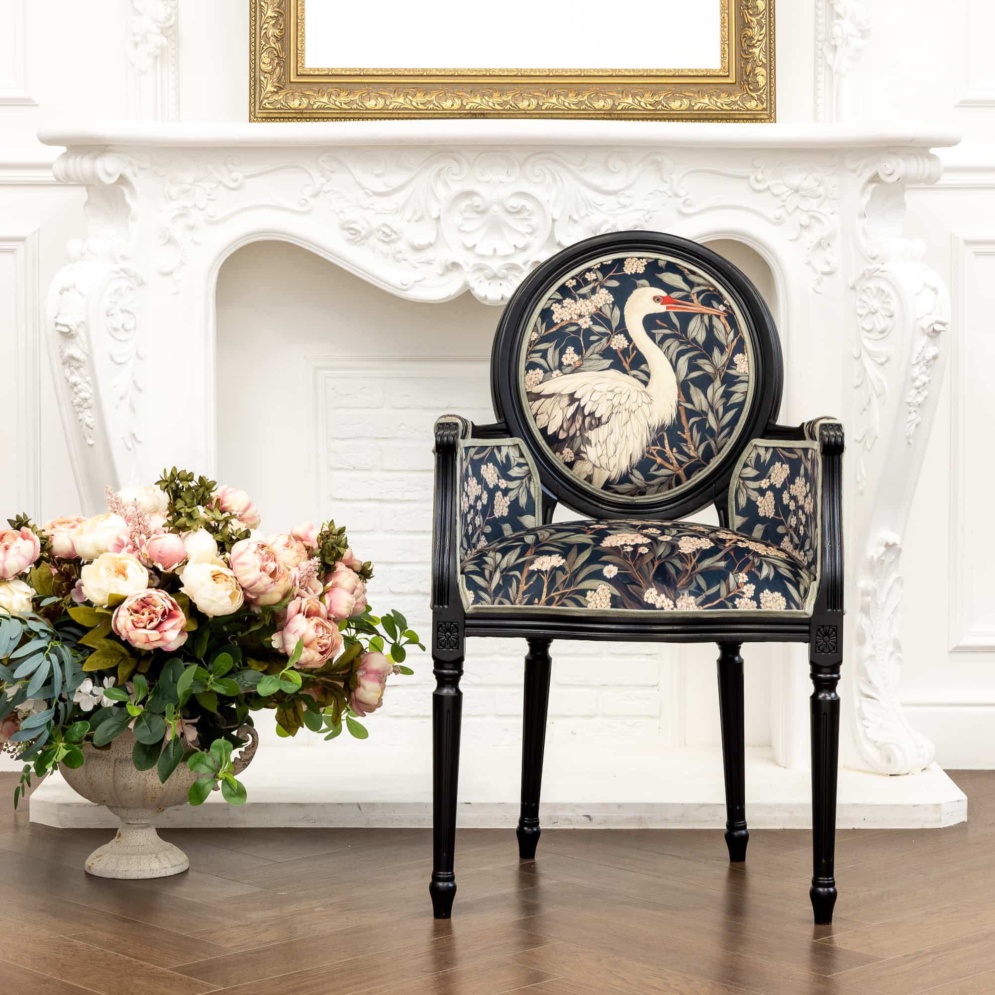 Кресло (стул со сплошными подлокотниками) «Белая птица» – это живописное сочетание цветов и форм: на спинке, словно ожившая сказка, среди изумрудных зарослей расположилась белоснежная птица с горделивой шеей и коралловым клювом. Черное полотно сиденья и внутренних сторон подлокотников украшено изящным узором из зеленых листьев и белоснежных соцветий. Задняя часть спинки и внешние стороны подлокотников, выдержанные в природном зеленом оттенке, создают ощущение гармонии с окружающей природой. Завершает образ зеленый кант, вторящий листве, и насыщенный черный цвет каркаса.