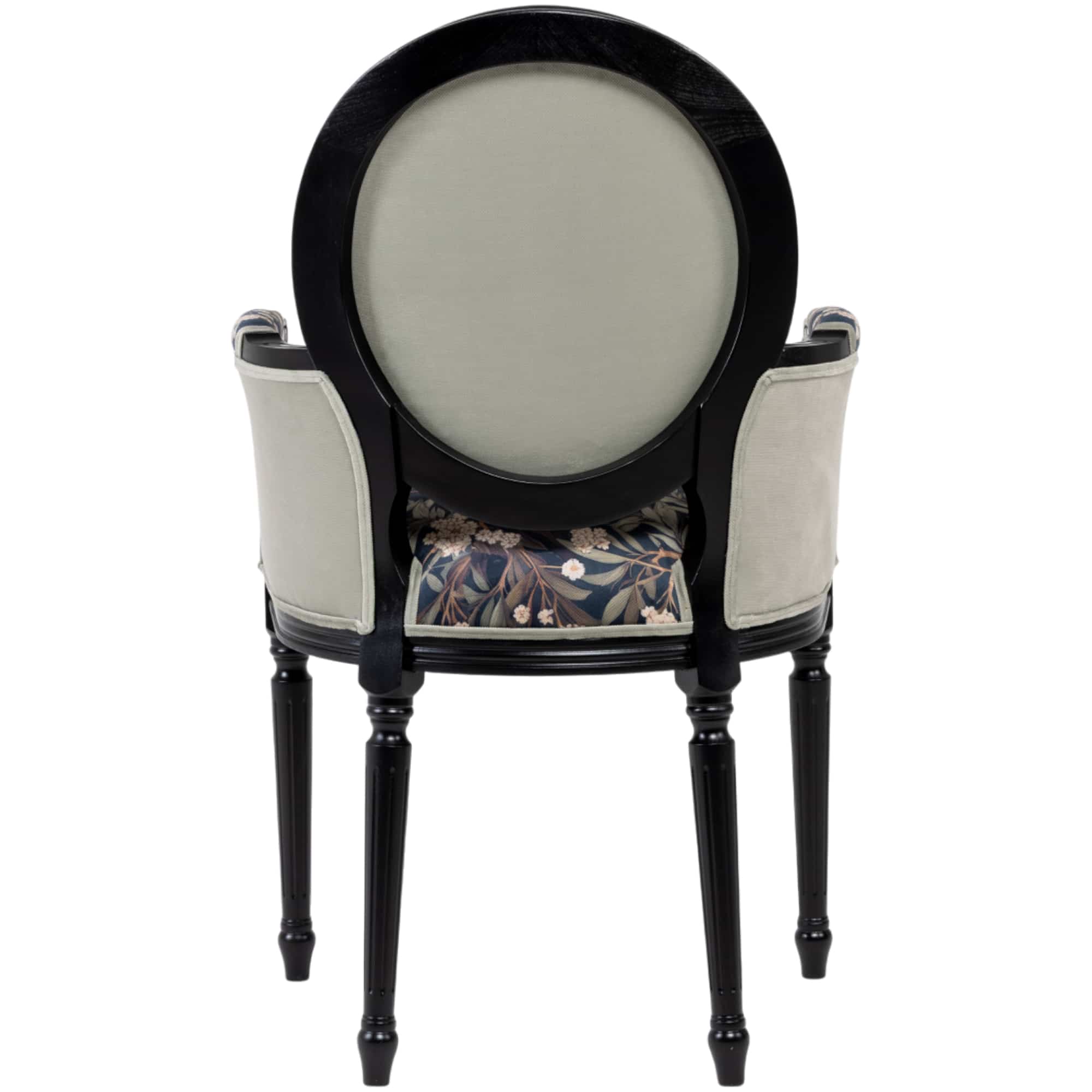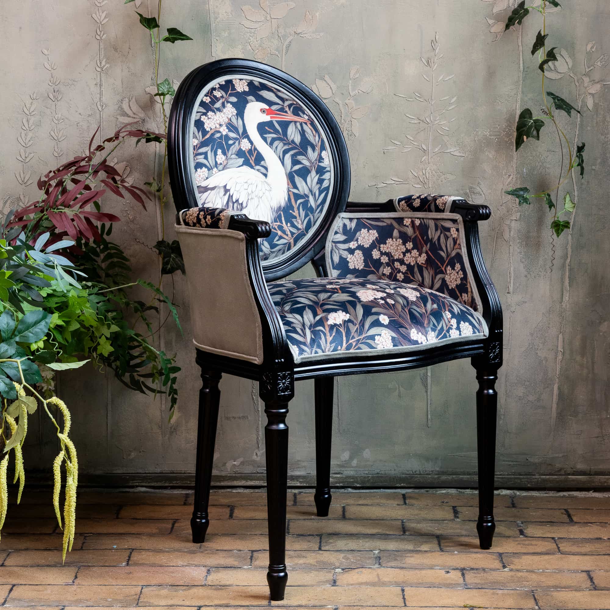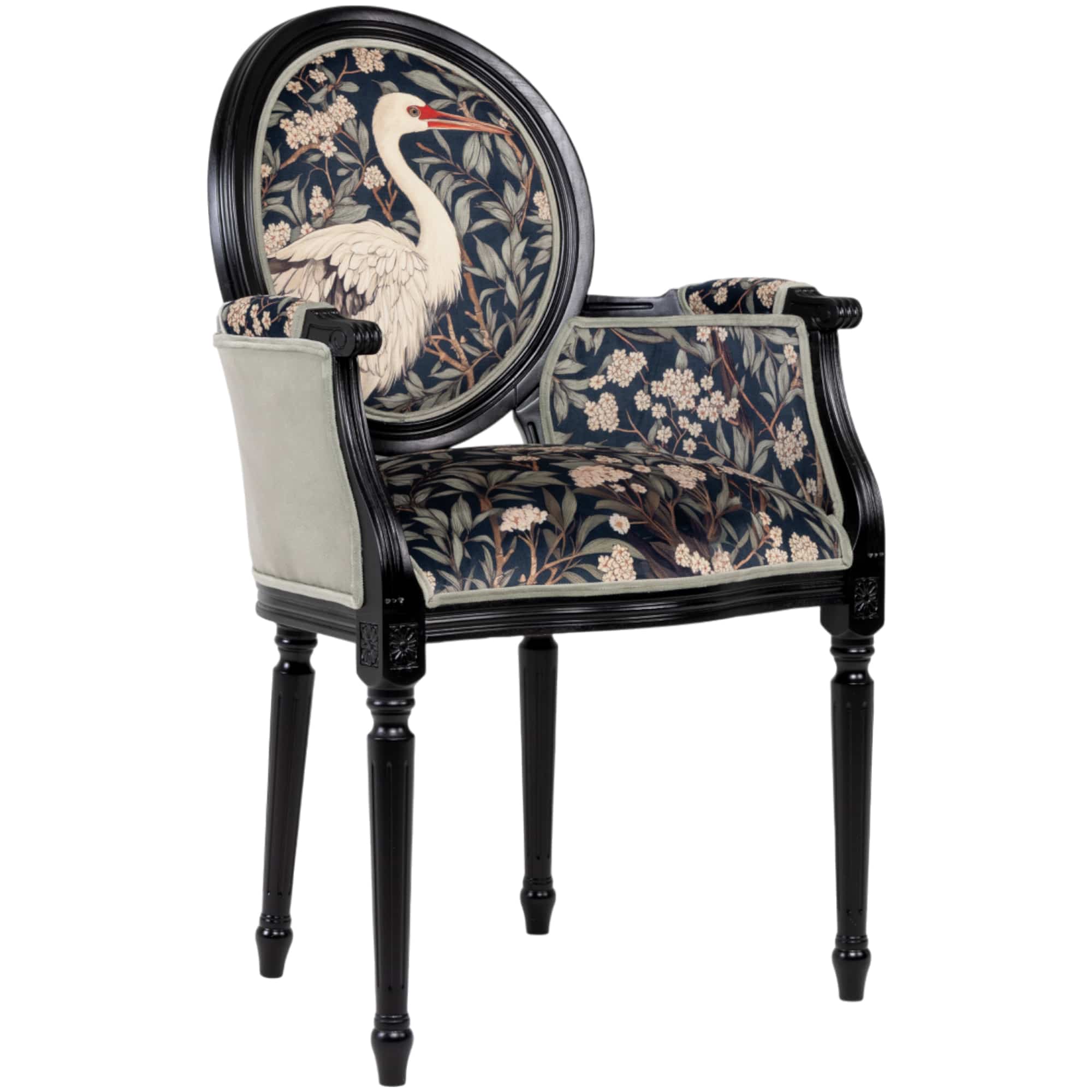 Кресло (стул со сплошными подлокотниками) «Белая птица» – это живописное сочетание цветов и форм: на спинке, словно ожившая сказка, среди изумрудных зарослей расположилась белоснежная птица с горделивой шеей и коралловым клювом. Черное полотно сиденья и внутренних сторон подлокотников украшено изящным узором из зеленых листьев и белоснежных соцветий. Задняя часть спинки и внешние стороны подлокотников, выдержанные в природном зеленом оттенке, создают ощущение гармонии с окружающей природой. Завершает образ зеленый кант, вторящий листве, и насыщенный черный цвет каркаса.