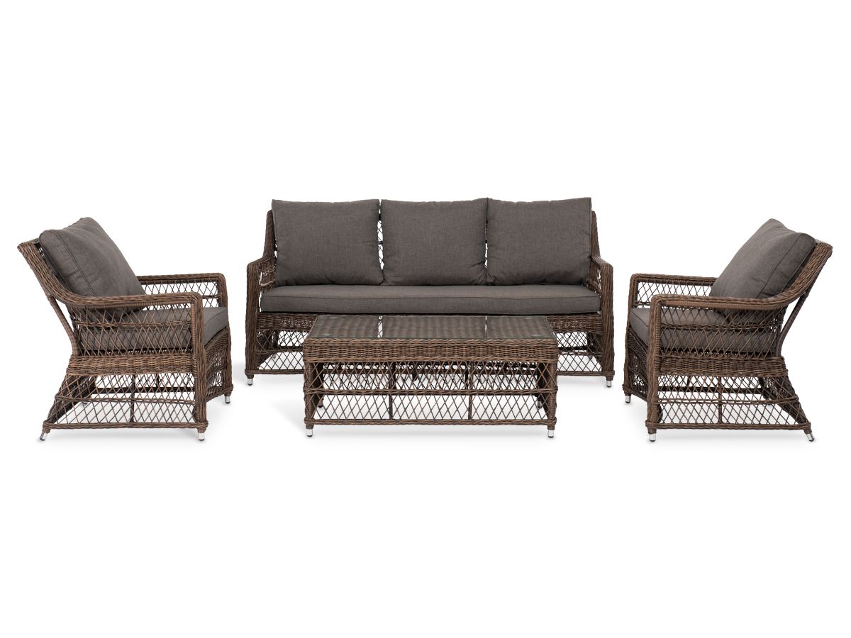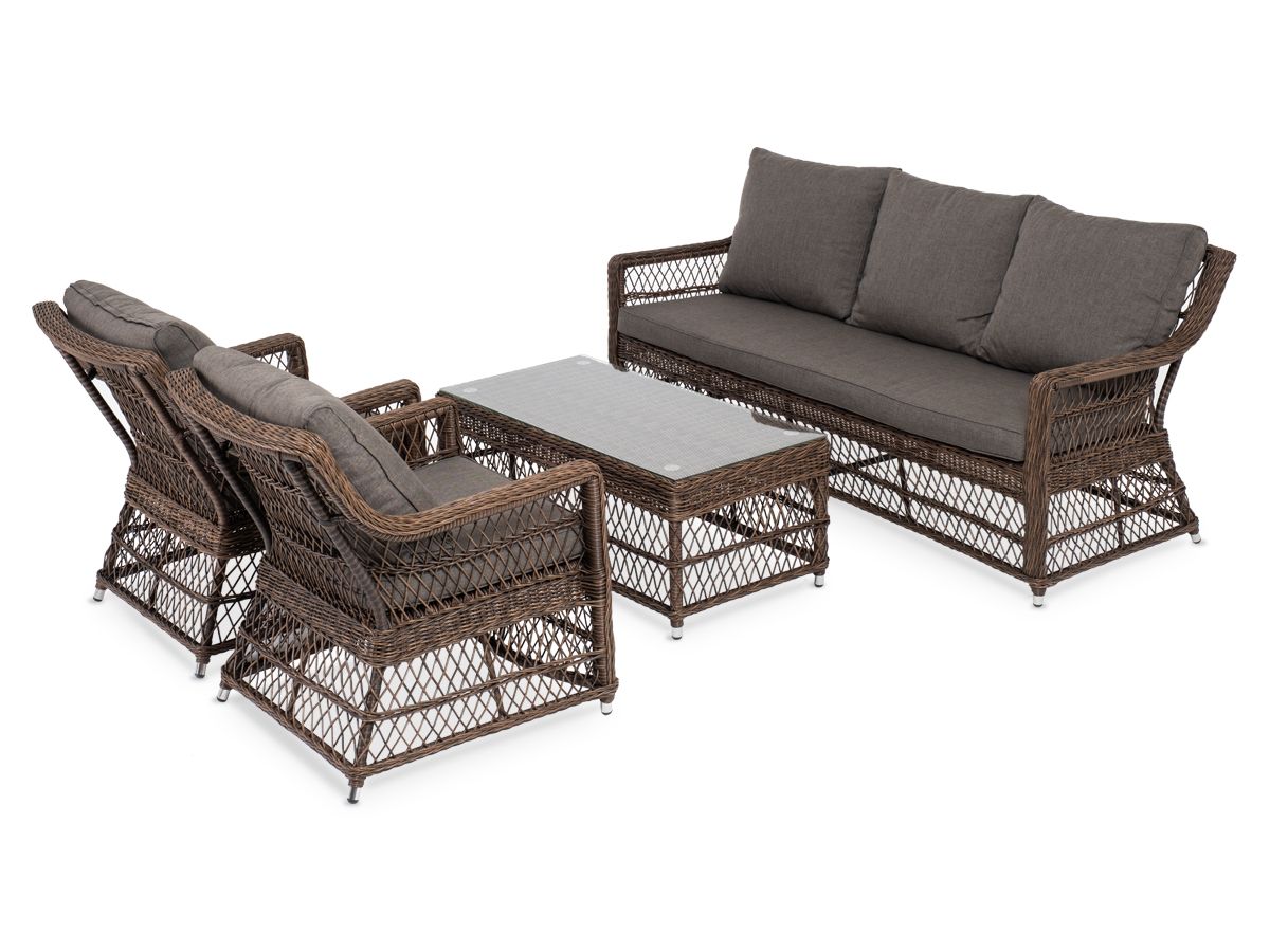 Уличная мебель имеет алюминиевый каркас, ручное плетение, сделанное из коричневого искусственного ротанга. Предусмотрены мягкие подушки из полиэстера серо-коричневого цвета с плотностью 230гр/м2. Они имеет влагоотталкивающую пропитку. Рабочая поверхность столика изготовлена из закаленного стекла толщиной 5 мм. -