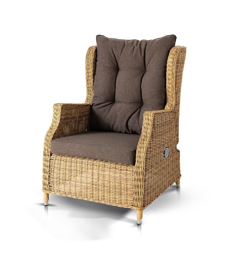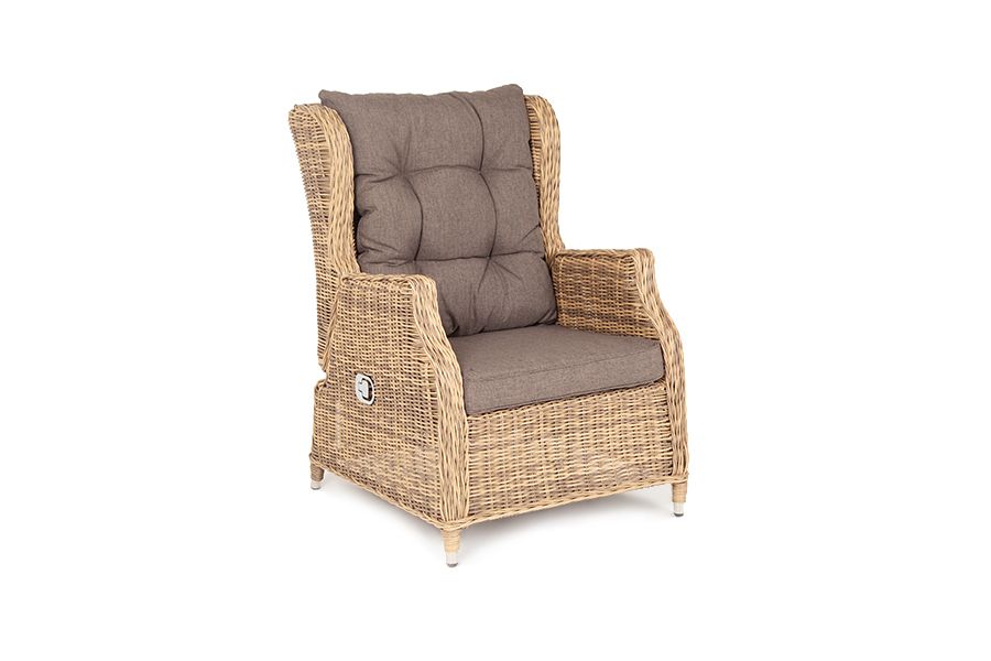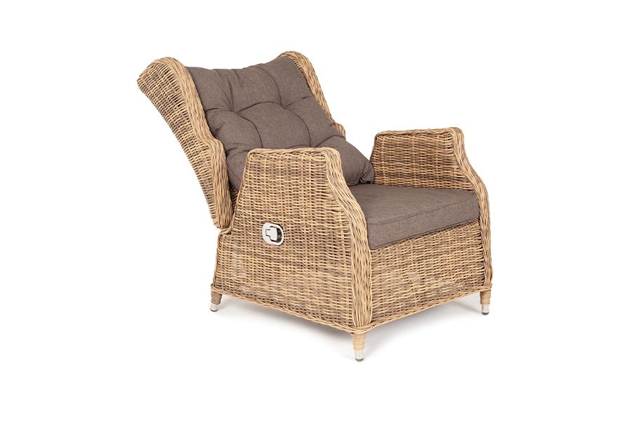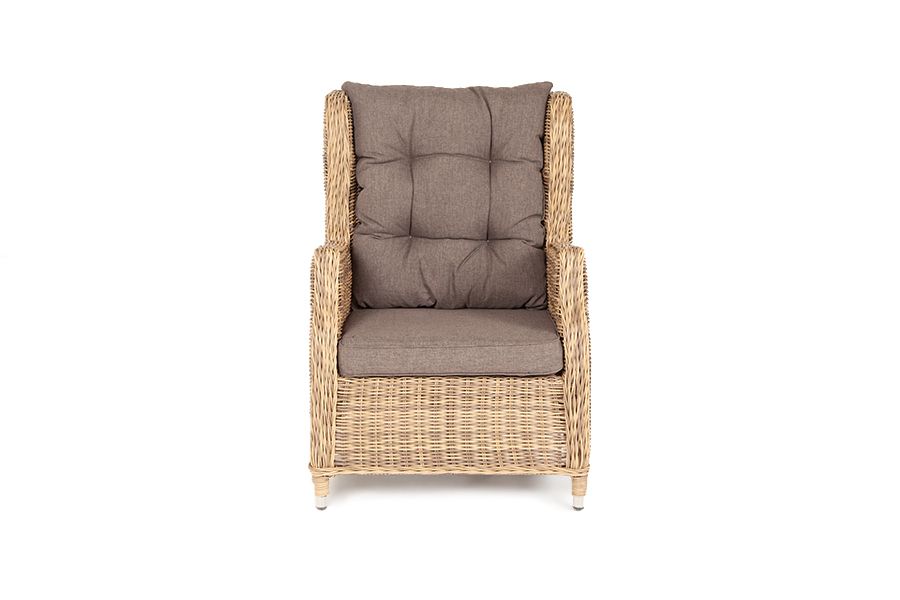 В основе мебели находится алюминиевый каркас высокой прочности, который оплетен круглым искусственным ротангом. Представлена в натуральном соломенном оттенке.