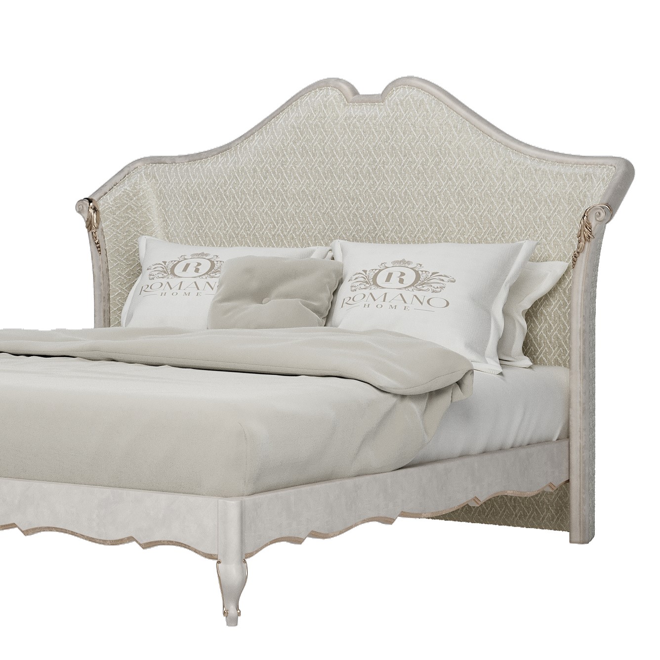 - Фигурное изножье на высоких ножках (доп. плата 23 000 руб.) — придает массивной кровати визуальную легкость и изящество, завершает ее форму и предотвращает «оседание» визуального веса.