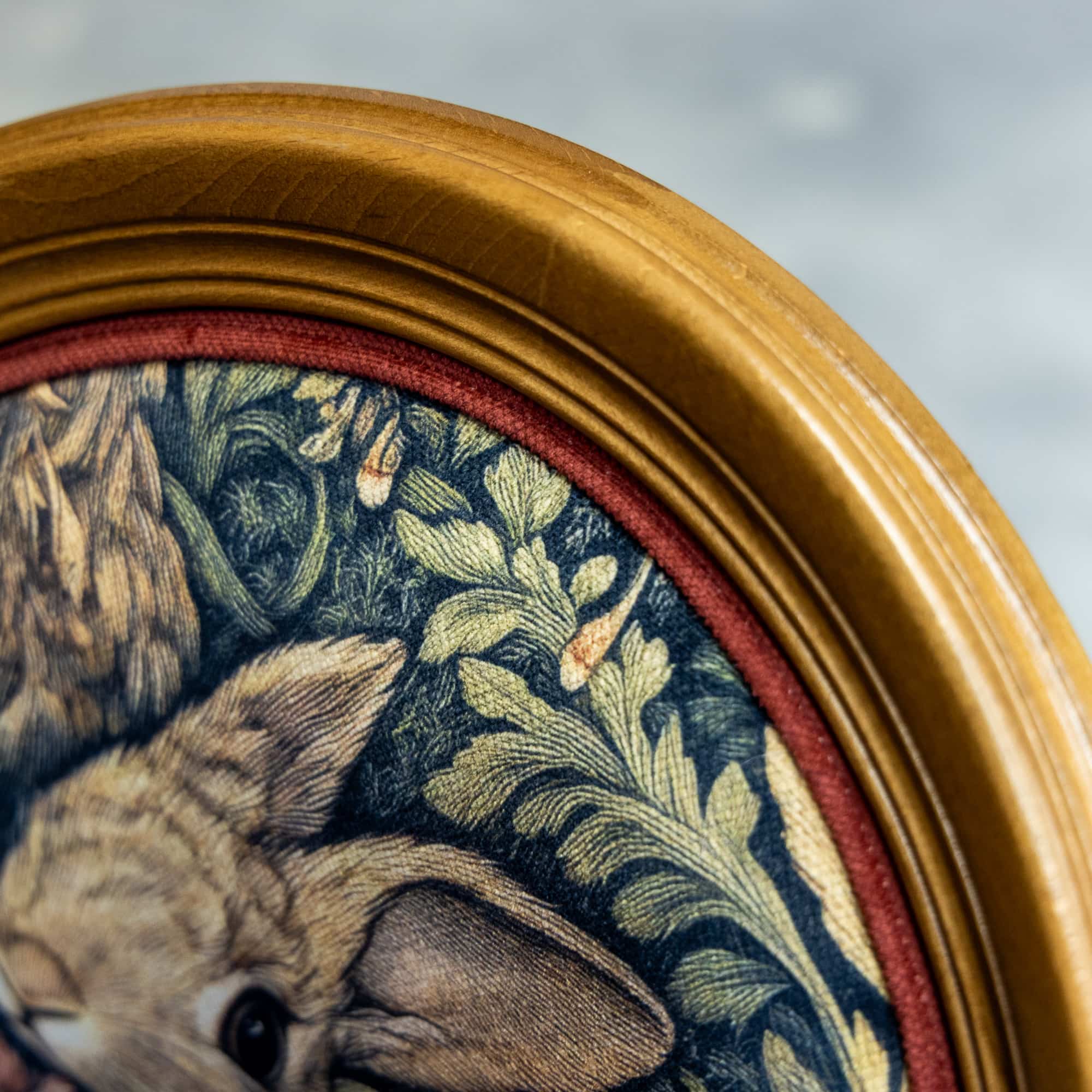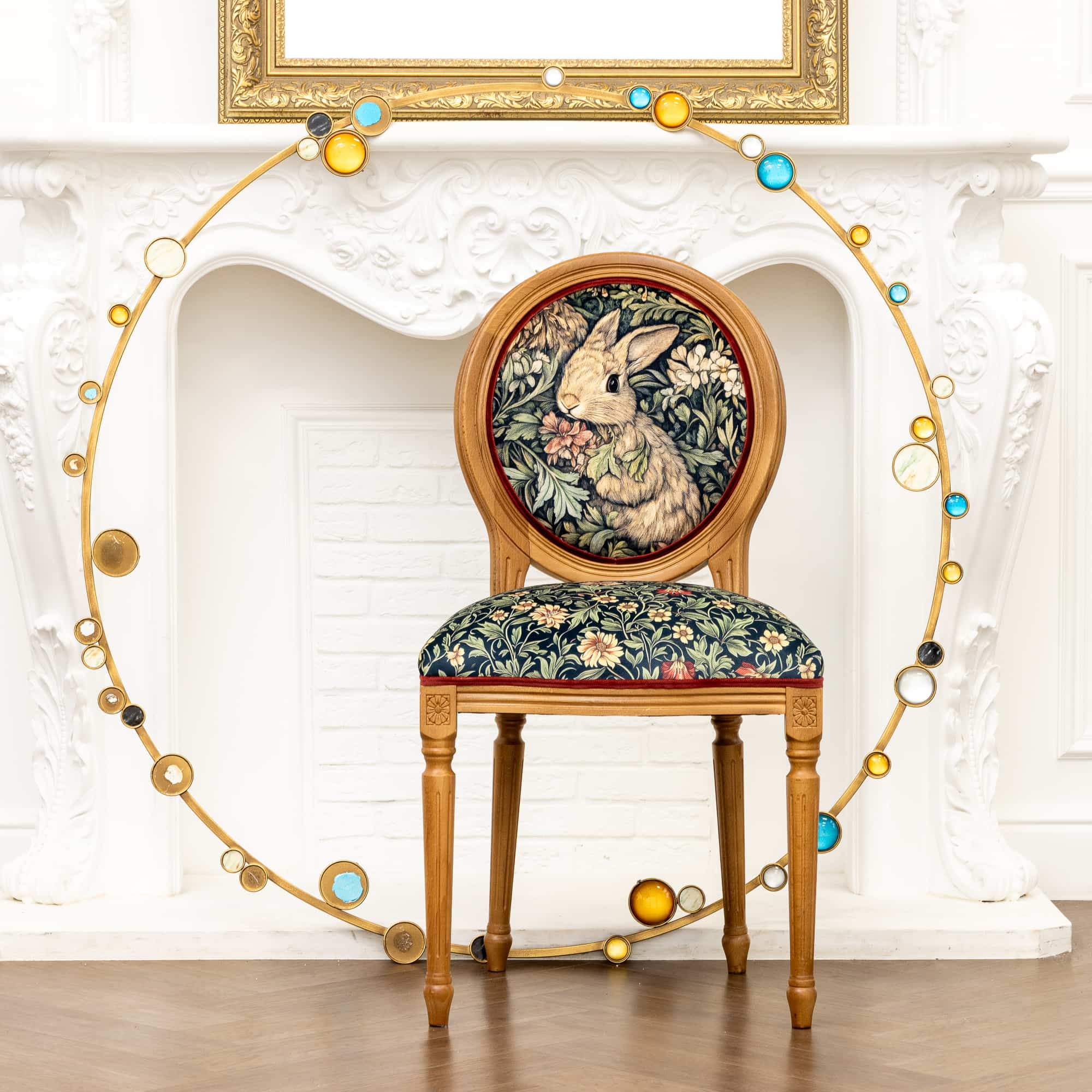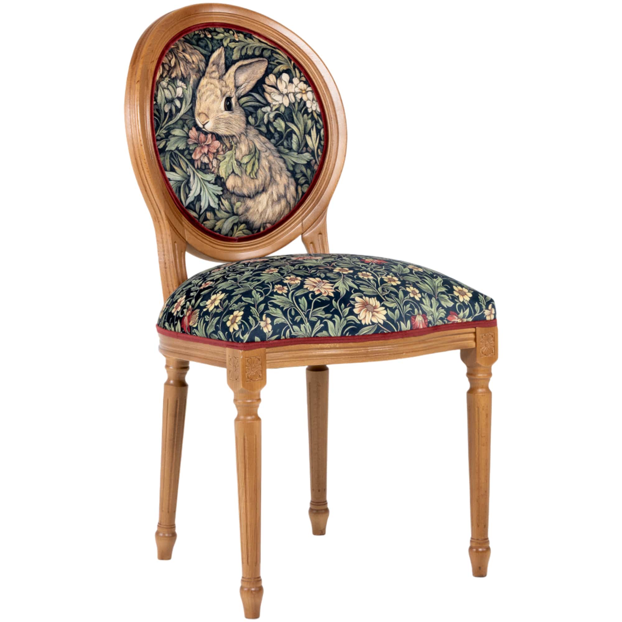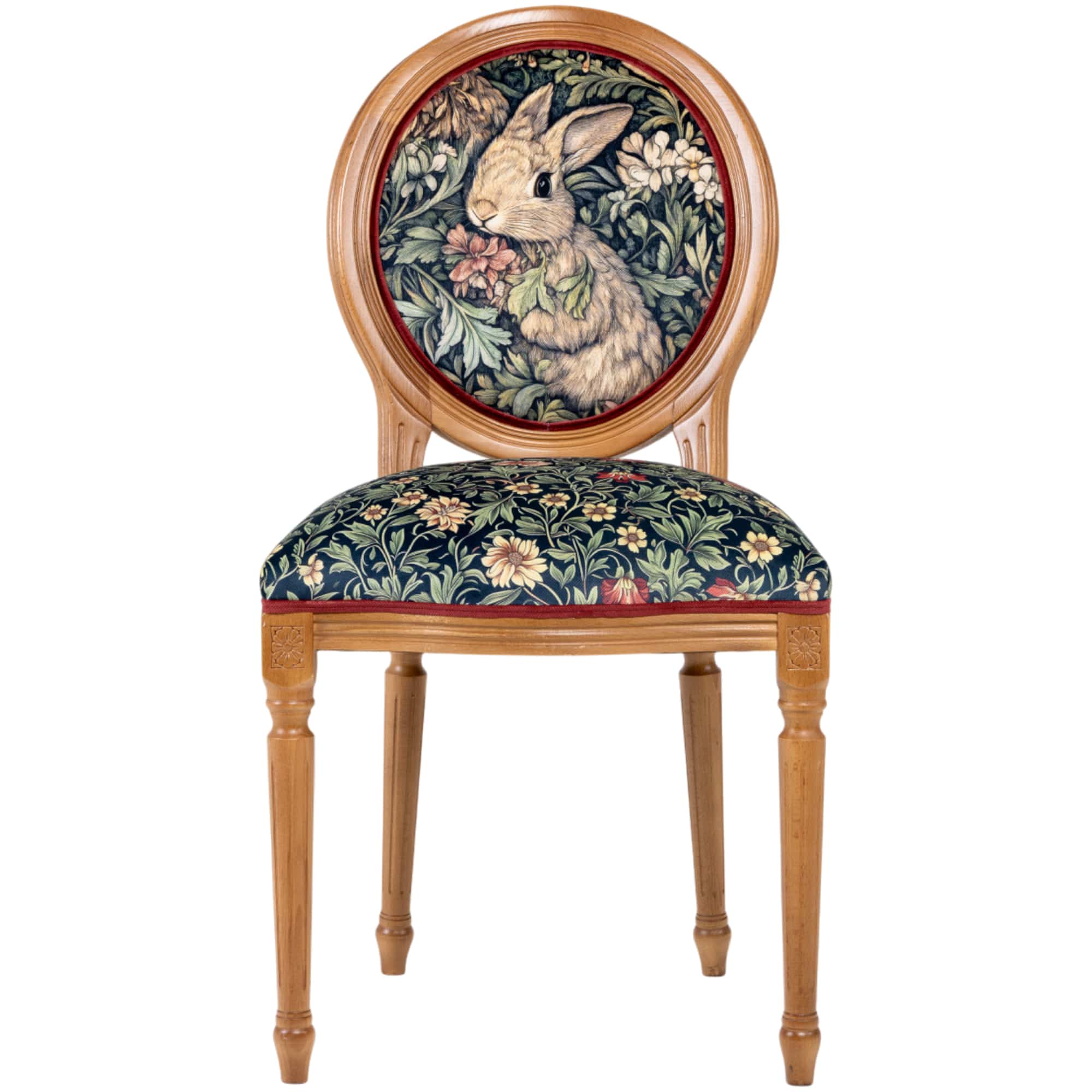 Стул «Бал сказок. Заяц» в стиле Уильяма Морриса – это изысканный предмет мебели, воплощающий в себе любовь к природе и декоративному искусству, характерные для творчества выдающегося английского дизайнера. Главной особенностью стула является уникальная обивка, украшающая его спинку и сиденье.