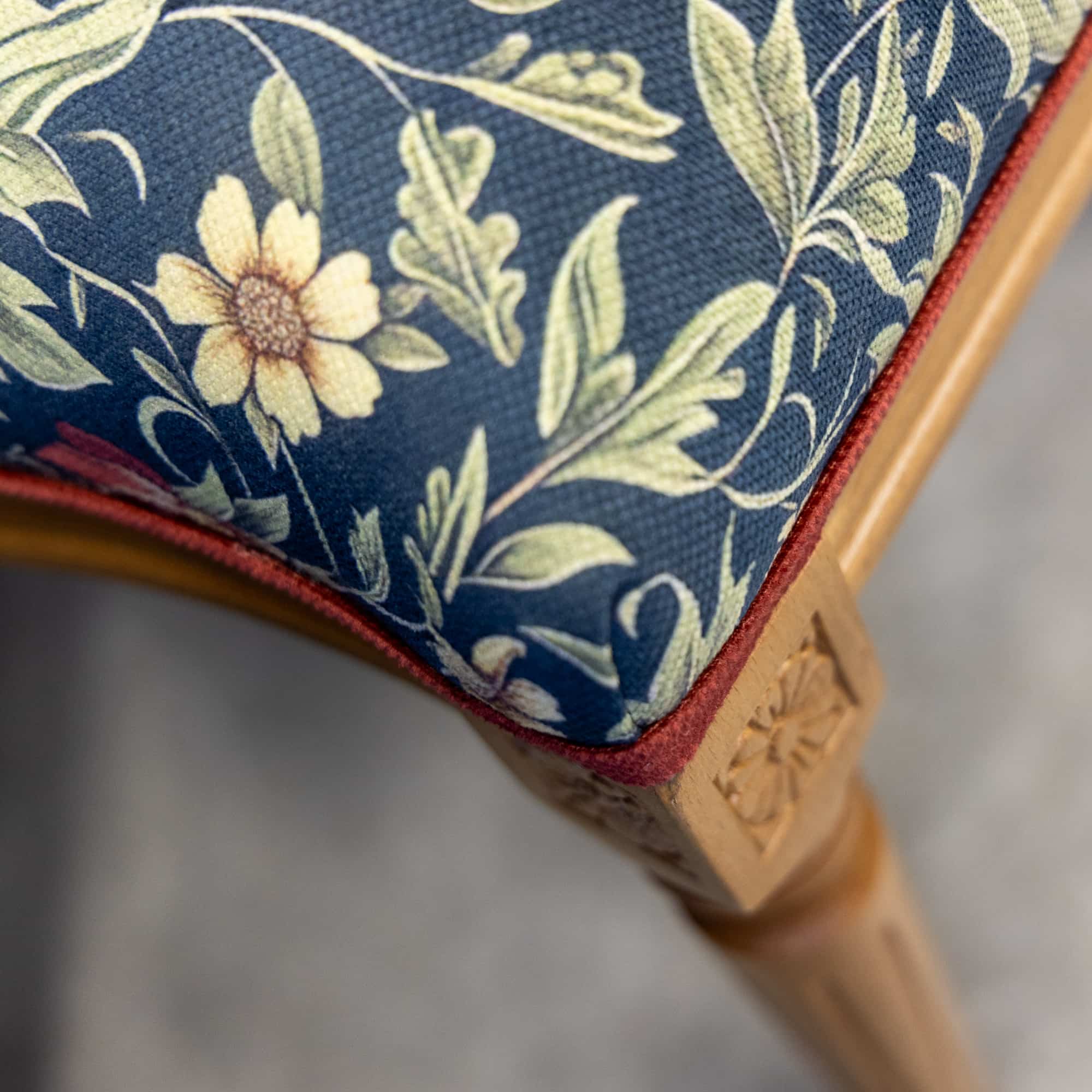 Сиденье стула украшено характерным для Уильяма Морриса природным узором. На черном фоне распускаются красные, желтые и розовые цветы, переплетенные с зелеными листьями.