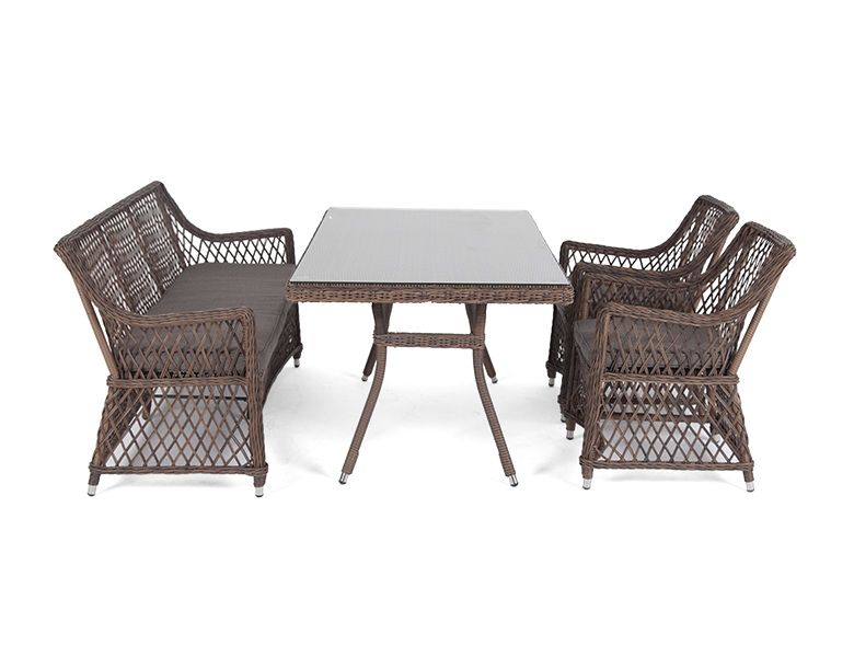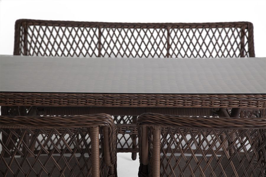Все предметы мебели изготовлены из прочного алюминия, вручную оплетенного долговечным искусственным ротангом. На креслах и диване предусмотрены подушки со съемными чехлами и влагостойкой пропиткой. Стол укомплектован прочным стеклом толщиной 5 мм для удобства использования.