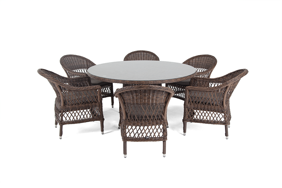 В комплект входит круглый обеденный стол «Эспрессо» (1500×1500×750мм) с ударопрочной стеклянной столешницей и 6 кресел коллекции «Сицилия» 590×640×820 мм.