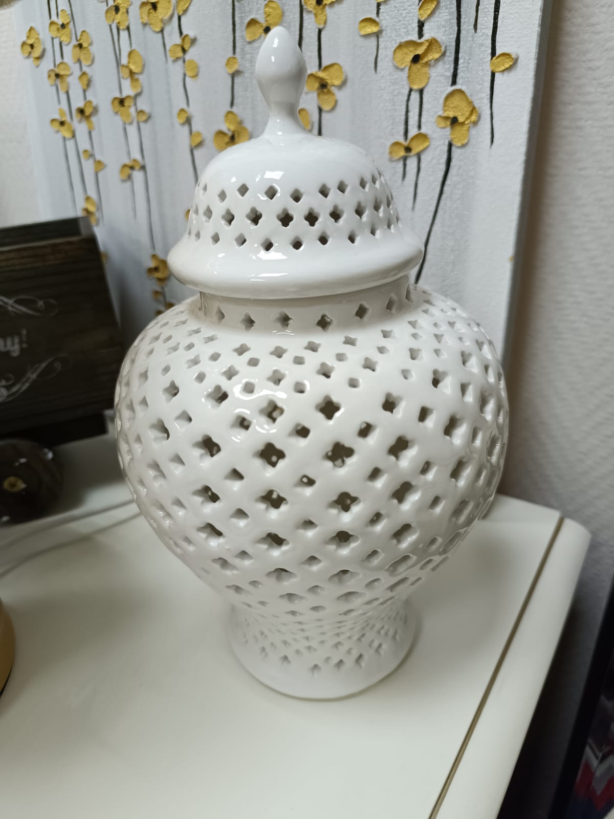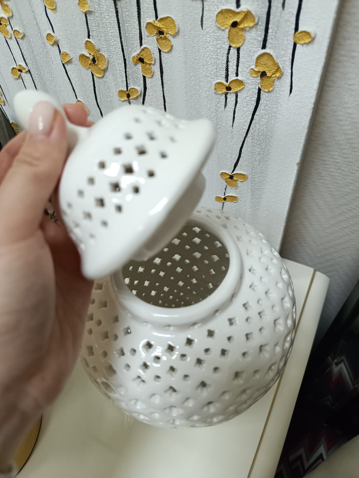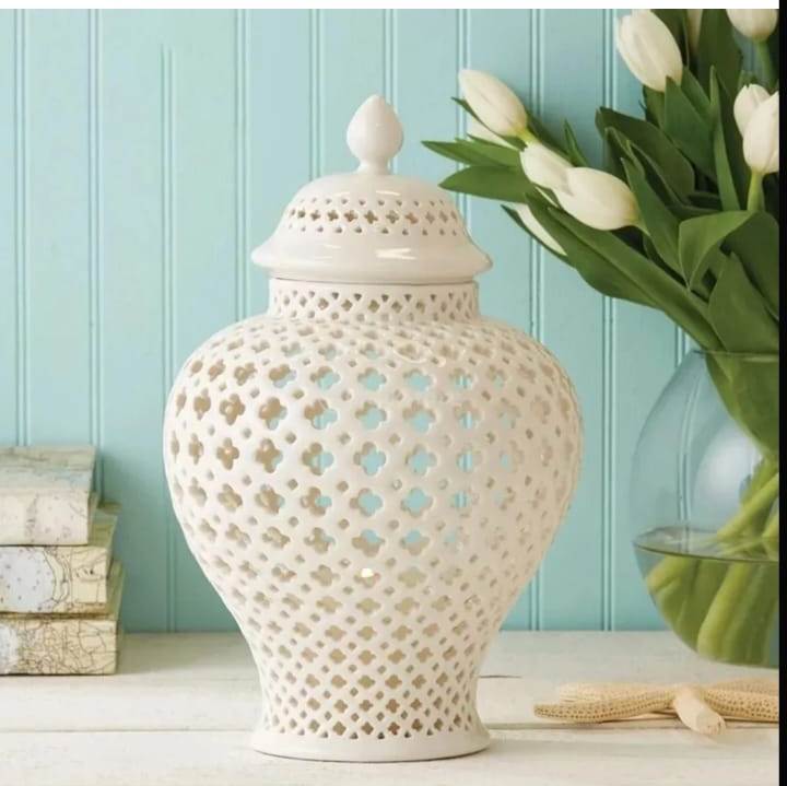 Ваза Джованна с крышкой изготовлена из высококачественной керамики белого цвета. Уникальный дизайн вазы в стиле китайской керамики сделан в виде красивой дырочки, что придает ей изысканный и изящный вид. Эта ваза не только является прекрасным декоративным элементом для интерьера, но также функциональной - в нее можно поставить свечу, чтобы создать уютную и романтическую атмосферу в помещении. Размеры вазы позволяют разместить ее как на полу, так и на столе или тумбочке. Этот товар идеально подойдет для тех, кто ценит красоту и оригинальность в декоре своего дома.