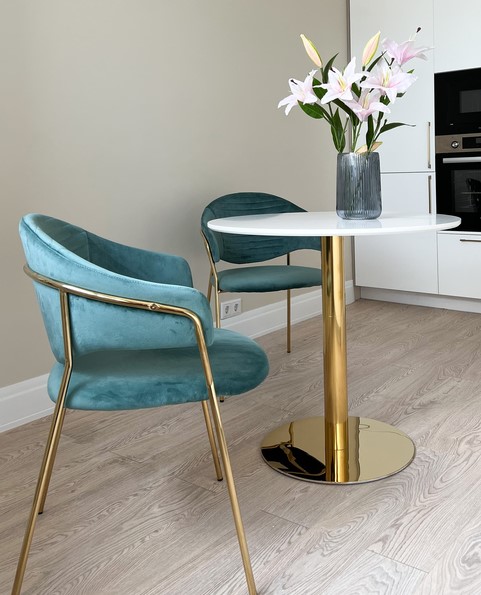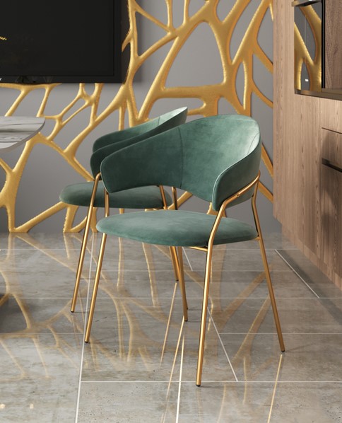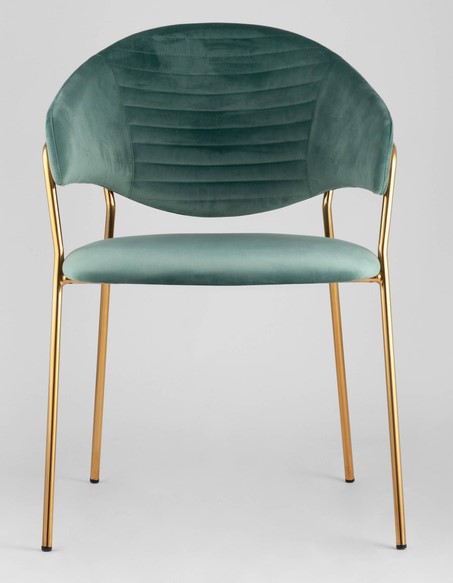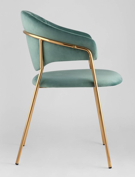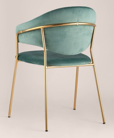 Стильный кухонный стул с оригинальной формой спинки, высокой поддержкой и подлокотниками. В качестве обивки используется мягкий велюр. Металлический каркас золотого цвета огибает спинку и выступает аккуратным акцентом модели. Широкое сиденье обеспечивает удобную посадку и уют.