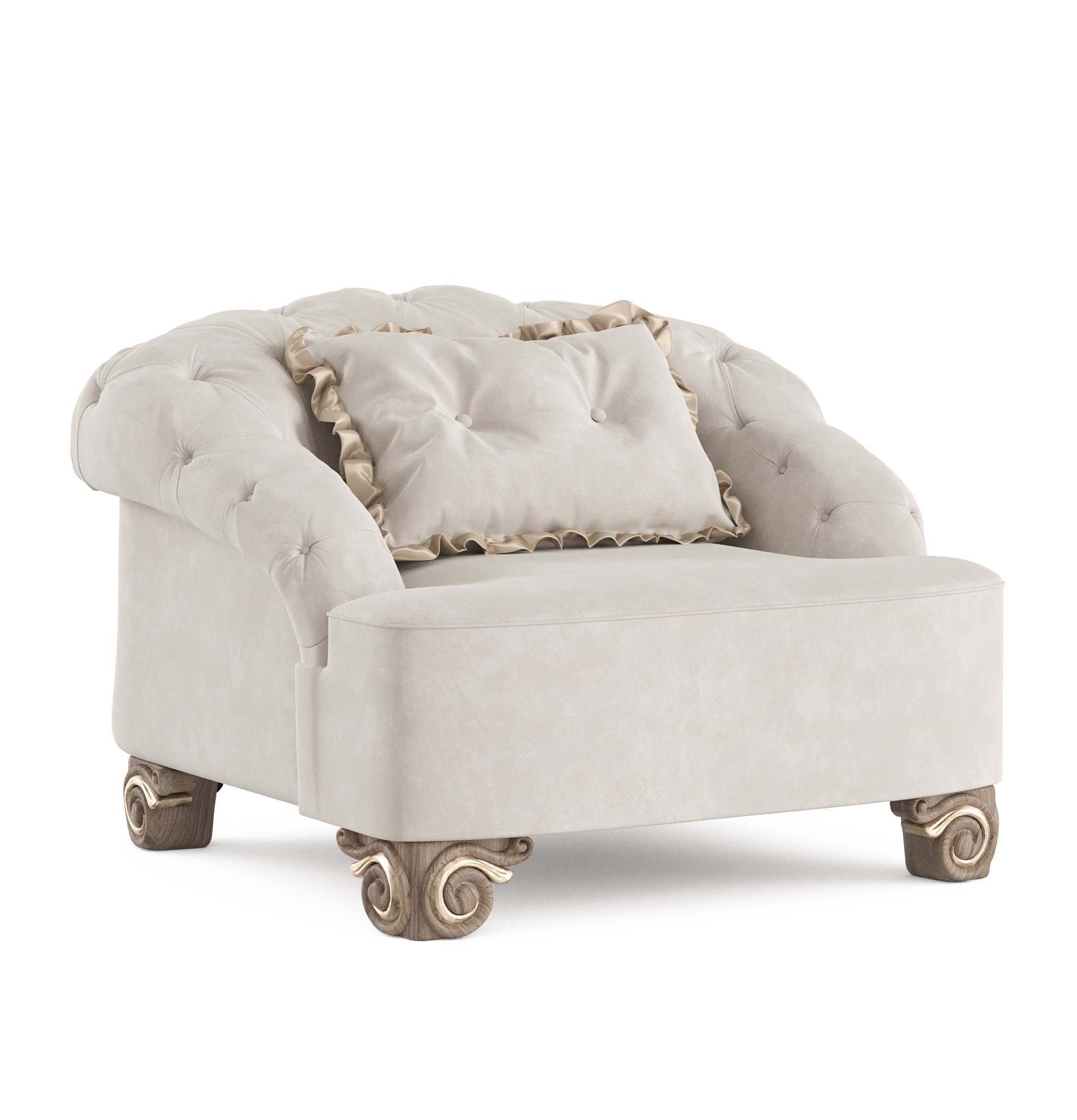 - Ножки из массива дерева: Обеспечивают креслу устойчивость и визуальную легкость, контрастируя с мягким верхом. Дерево может быть окрашено в любой цвет или декорировано поталью для расстановки стильных акцентов.